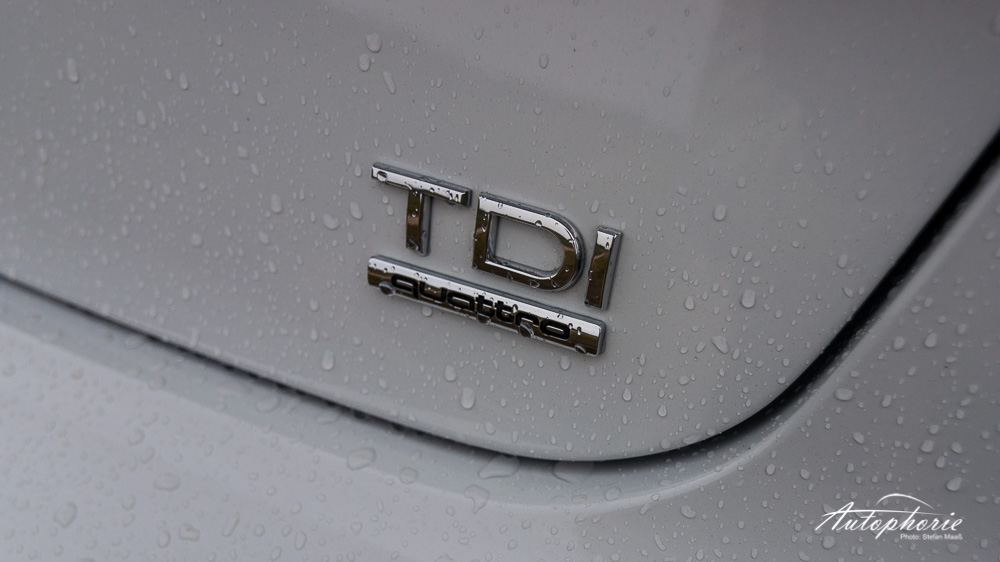 Da steht er, der Ibisweiße Traum eines Firmenwagens. Die Buchstaben TDI trägt das Heck unterhalb der rechten LED-Rückleuchte, die clever durch den Kofferraumdeckel geteilt wird. Unter dem dezent angedeuteten Spoiler an der Kofferraumkante prägt der quattro-Badge den maskulinen Rücken der Limousine. Eine hohe Schulterlinie durchzieht die Karosserie von vorn bis hinten, optionale Seitenschweller verdeutlichen die markante Form. Kein Wunder, auf den bärenstarken Biturbo-Diesel mit 313 PS (230 kW) gehört nun mal ab Werk das S-line-Paket und nichts anderes.