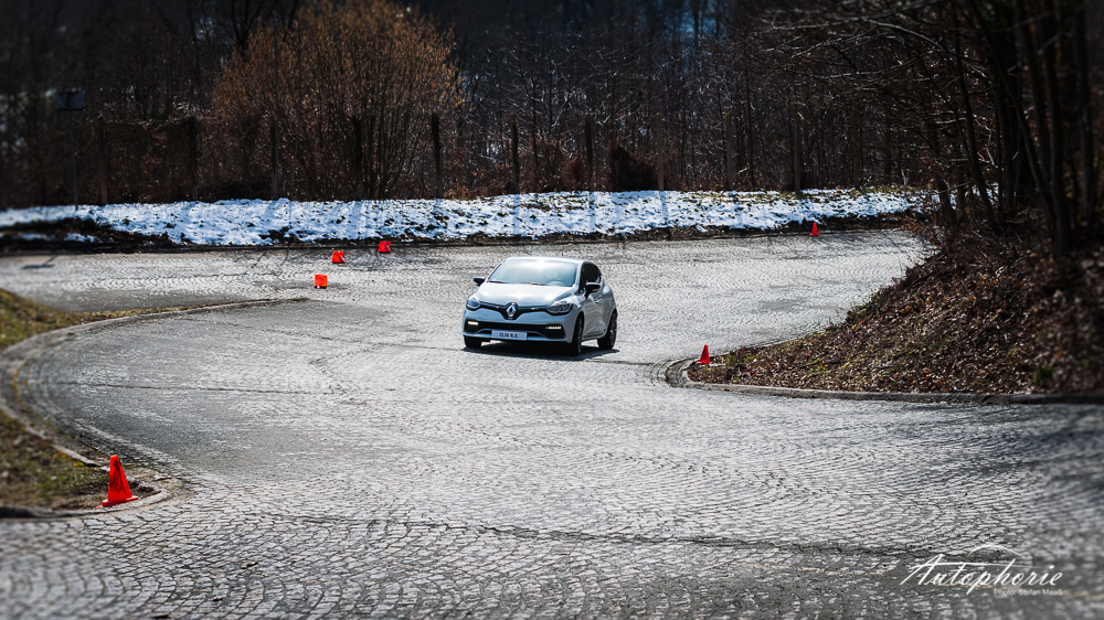 Er ist der kleine Krawallbruder des Renault Megane R.S., der junge Spund, der unerschöpflich scheint. Mit kühnem Understatement hat er mein Unterbewusstsein bereits nach der ersten S-Kurve gepackt. Den Übergang von Teer zu Kopfsteinpflaster inmitten des Apex bügelt das raffinierte Sportfahrwerk einfach weg. Es folgt eine längere Links, die Elektronik hält sich wie gewollt zurück und greift nur in äußersten Ausnahmefällen ein. Ich merke wie der Kleine Traktion verliert – es piept und tönt hier und dort um Schlupf zu signalisieren. Die Drehzahl eigentlich schon hinterm Begrenzer, die elektronische Differenzialsperre nur noch am regeln. Der Sportmodus, den ich noch während des Stands aktiviert habe, hat sich seinen Namen redlich verdient.