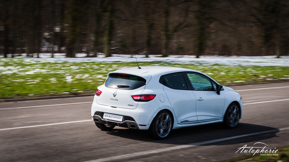 Ich kann nicht anders als Runde um Runde runter zu spulen. Renault hat sich trotz einigen Kritikwellen nicht beirren lassen weiter am 1.6 l Benziner samt Turboaufladung, der den freisaugenden 2.0-Liter-Benziner des Clio III RS ablöst, weiter zu tüfteln. Das Ergebnis kann sich sehen lassen und hämmert trotz gleicher PS-Zahl (200 PS) mit 25 Nm Drehmoment (240 Nm insgesamt) mehr auf das Getriebe ein. Wie Peter von Radical Mag schon festgestellt hat, wird der Renault Clio IV R.S. 200 (lediglich) mit einem 6-Gang-DSG ausgeliefert. Was das im Klartext heißt? Kaum spürbare Schaltvorgänge – der Grundcharakter des alten Clio III RS, der eben durch seine mechanische Wirkungsweise den Fahrer an die Maschine knüpfte scheint verloren gegangen. Ich kann Peter in gewisser Weise zustimmen; auch mir fehlt ebenfalls ein deutlicheres Feedback des Getriebes – in einigen Turns vermisste ich einfach den Ruck, der Schock, der mich bewusst werden ließ, ob ich bereits heruntergeschaltet habe oder nicht. Die Folge waren einige Sekunden, die ich in engen Kurven ließ. Nach einer kurzen Eingewöhnungsphase ist dies aber vergessen, den Motor hört man schließlich noch immer röhren. Von außen ist er sogar wesentlich voluminöser zu vernehmen als je zuvor.