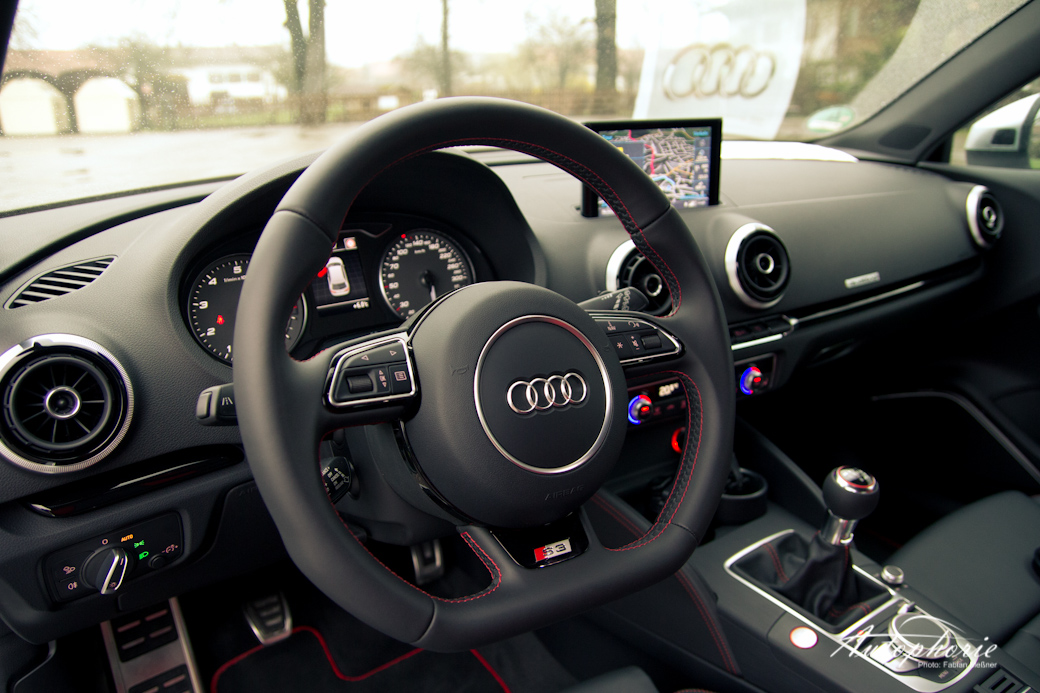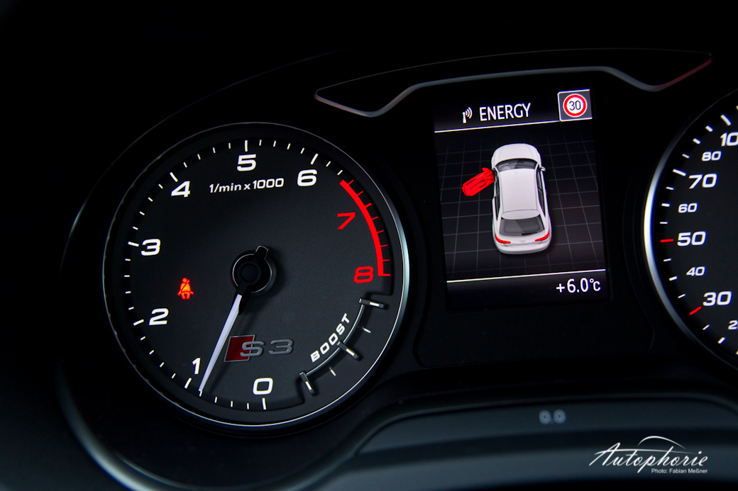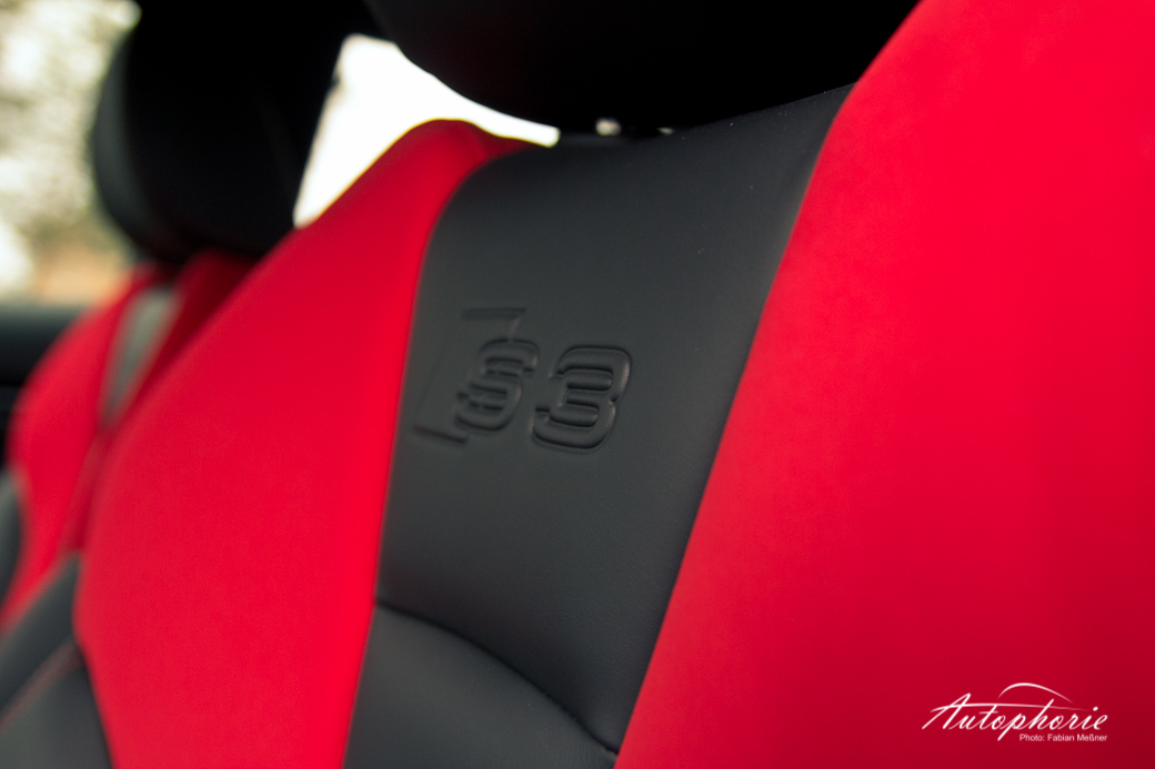 Im Innenraum ein klassischer Audi A3, MMI, bekannte Klimaanlage alles vorhanden. Neu ist das abgeflachte Sportlederlenkrad, die allgegenwertigen S-Markierungen und die Ladedruck bzw. Boost-Anzeige des Turboladers im Drehzahlmesser – ein nettes Gimmick. Die in unserem Fahrzeug befindlichen Ledersportsitze, die sich perfekt mit den roten Akzenten verbinden, wären nicht meine erste Wahl, da würde ich vielmehr die feinen Leder-Nappa-Sportsitze wählen, die sich mit der Rautensteppung so auch im RS6 Avant finden. Dezent und doch nobel, edel, passend, luxuriös.