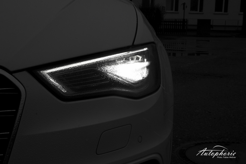 Das optionale LED-Licht hat so viele futuristische Funktionen, dass dazu ein ganz eigenständiger Testbericht sinnvoll wäre, ganz kurz und knapp, sieht aufsehenerregend aus und hat für einen einzigen Lichtleiter mehr Funktionen als aktuelle Smartphones. Autobahn-, Stadt- und Landstraßenlicht sind nichts neues, das können auch andere Hersteller schon, doch mittels Audi connect werden die Navigationsdaten im MMI Plus und damit die Streckendaten zu Rate gezogen, sprich das Auto weiß ob es an eine Kreuzung heranfährt und aktiviert so das „Kreuzungslicht“ oder stellt auch die Frontbeleuchtung anhand der GPS-Daten von Rechts- auf Linksverkehr um.
