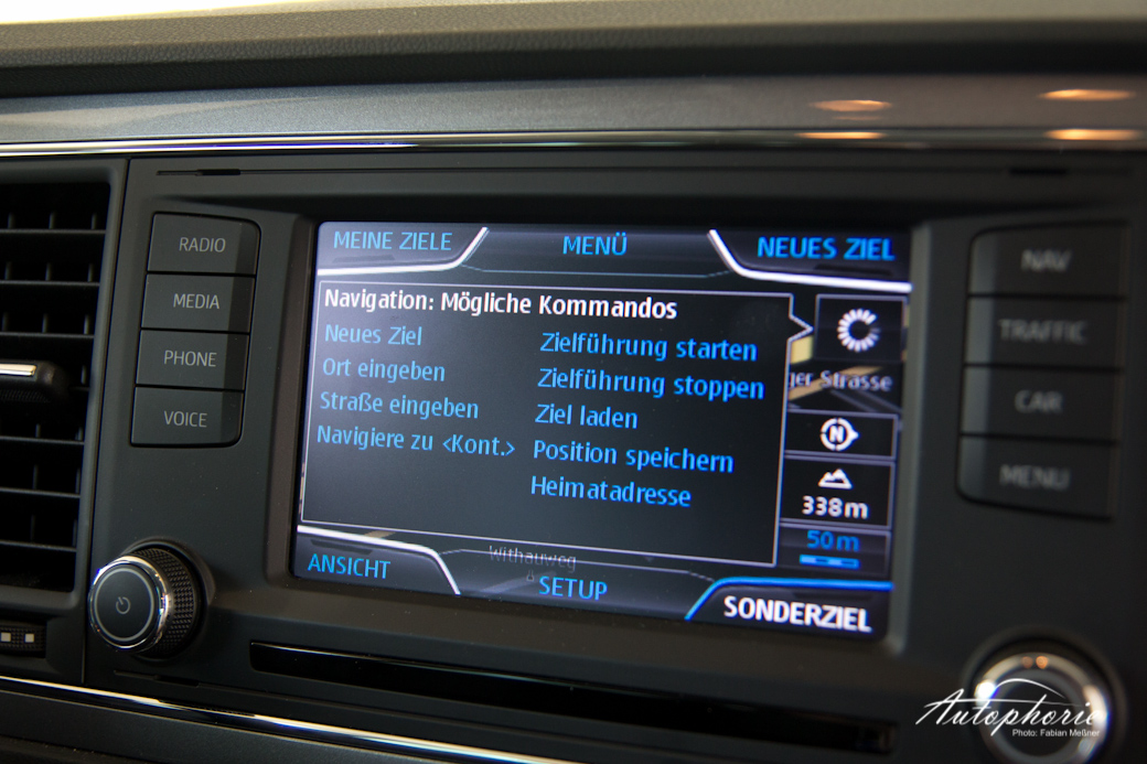 Neben dem Audi A3 bietet der Spanier bisher als einziger im VW Konzern die neuen Voll-LED Scheinwerfer an, die nicht nur besser aussehen als die altbackenen Halogenscheinwerfer, sondern auch deutlich angenehmer leuchten als Bi-Xenon Scheinwerfer (du bist nicht direkt blind, wenn dir der Leon entgegen kommt). Diese 990 Euro sind nicht nur optisch gut investiertes Geld, auch andere Benutzer deutscher Landstraßen werden es dir danken. Innen kommt das neue Multimediasystem zum Einsatz, das auch Golf und Octavia teilen. Die Näherungssensorik ist nicht so schön implementiert wie im Golf 7, funktioniert aber ebenso gut, kostet dort überraschenderweise mit 505 Euro eine ganze Stange weniger Geld als im Leon (690 Euro). Ein Problem teilen überdies aber noch alle Modelle aus dem VW Konzern: Kommunikation mit dem iPhone 5. Im Seat, wie auch bei allen anderen VWAG Modellen, lässt sich das Smartphone aus Kalifornien aktuell nur per Bluetooth verbinden. Die Qualität der Audiowiedergabe kann sich jedoch hören lassen. Die Telefonie funktioniert tadellos in klarer Sprachqualität.