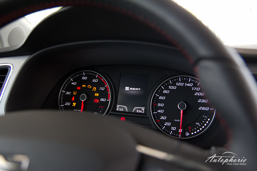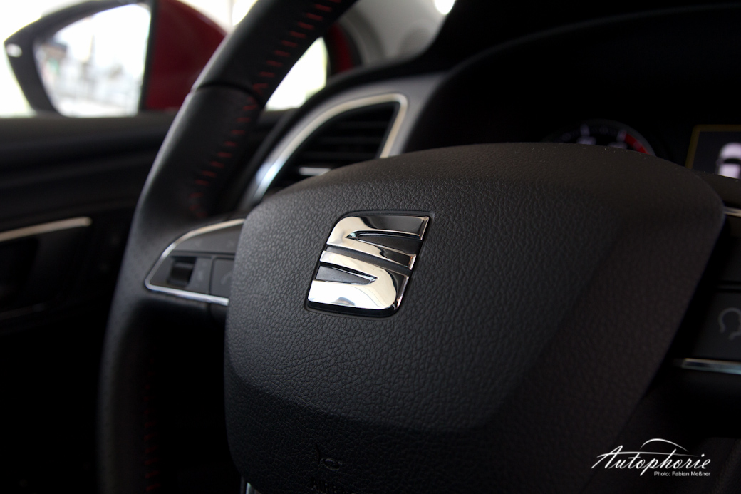 Abseits von elektronischen Helferlein fährt sich der Leon sehr ordentlich, egal ob in Eco oder Sport-Mode bringt er seine Insassen flott und zielsicher von A nach B. Die 5,2 Liter Normverbrauch konnte ich bisher noch nicht bestätigen – nur im Stopp and Go-Verkehr standen 4,3 Liter/100km auf der Uhr-, knapp unter sechs Litern auf 100 Kilometern lässt sich der Leon allemal bewegen. Die Streuung zur spritzigen Fahrweise ist dabei nur sehr gering, so waren 7,3 Liter das Maximum, was ich dem Tank entlocken konnte. Das „Seat Drive Profile“ verändert in drei Stufen die Motorcharakteristik sowie die Lenkunterstützung. In Normal, Eco oder Sport verändert sich dementsprechend spürbar das Kennfeld des Motors – zwischen 3.000 bis 4.000 Umdrehungen hängt er satt und direkt am Gas -, über die veränderliche Lenkunterstützung vermag ich nur zu sagen, das können andere besser. Der Unterschied zwischen Eco und Sport ist marginal, in beiden Fällen zu schwammig – direkter als beim Vorgänger 1P aber noch nicht optimal -, das hat ein FR (Formula Racing) nicht verdient, hier sollte nachgebessert werden. Ganz ansehnlich ist dabei das Ambientelicht, welches von Weiß (Normal, Eco) in Rot (Sport) wechselt. Zusammen mit den roten Ziernähten kommt zumindest optisch ein Hauch mehr Sportlichkeit auf Knopfdruck.