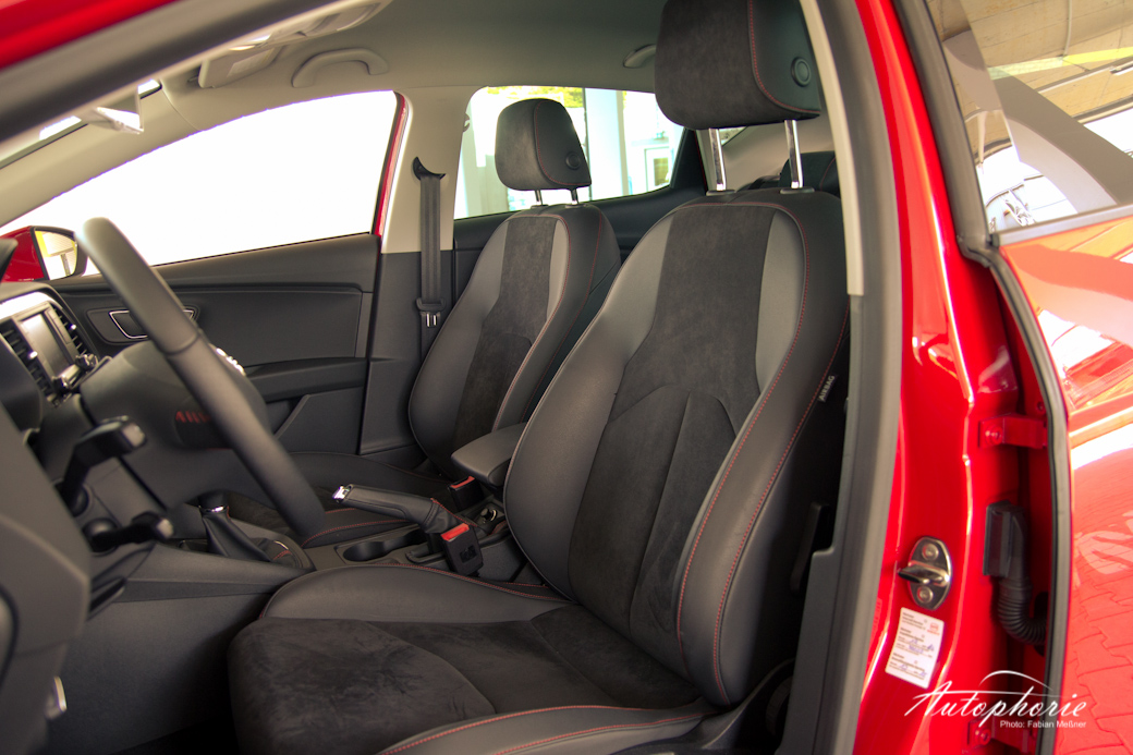 Das Alcantara-Stoff-Leder-Paket für den FR ist nicht ganz so hochwertig, wie eine vergleichbare Ausstattung im Golf, weiß mit roten Ziernähten und gutem Seitenhalt davon abzulenken. Überhaupt ist enorm viel Platz, die Kompaktklasse benötigt bald einen neuen Namen. Vergleiche zu ziehen fällt schwer, denn selbst Mitstreiter in dieser Klasse haben teilweise weniger Raumgefühl als ein Kleinwagen, über mangelnden Platz an sich kann sich kein Mitfahrer beschweren, selbst eine in den Kofferraum gesperrte Freundin würde hier noch „angenehm“ mitreisen.