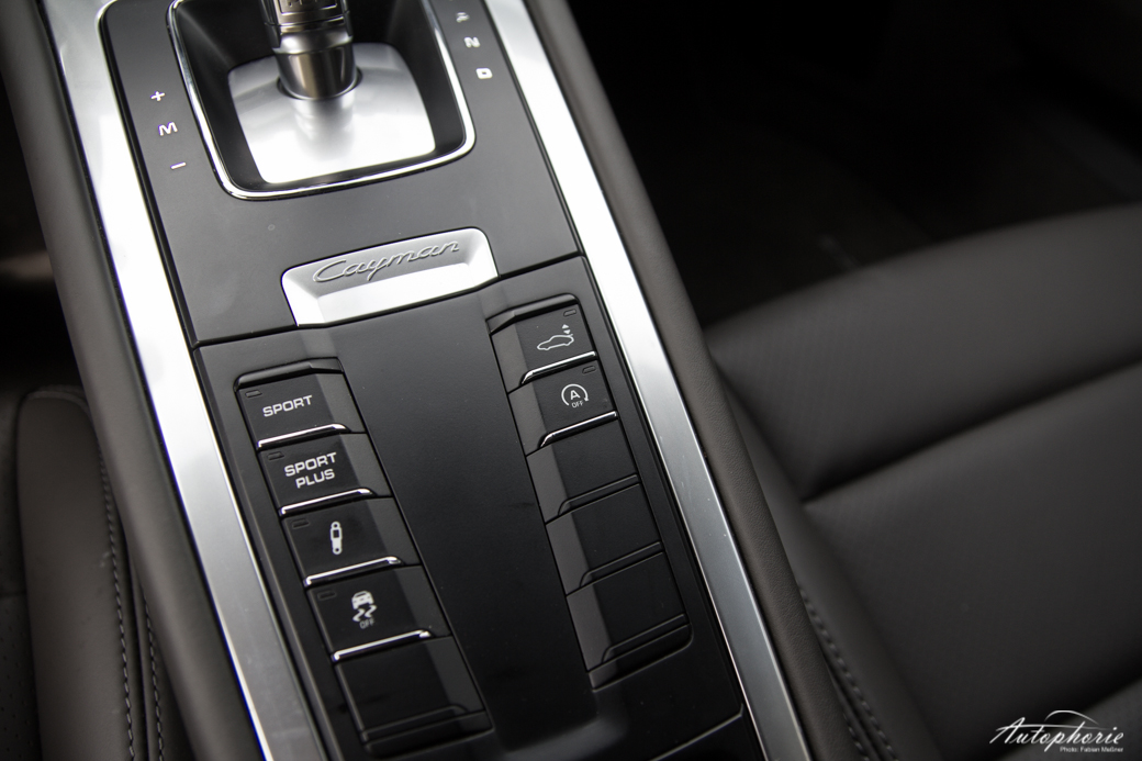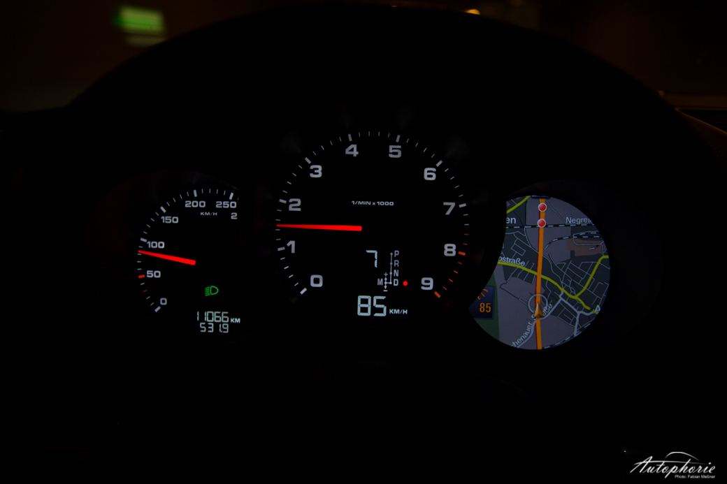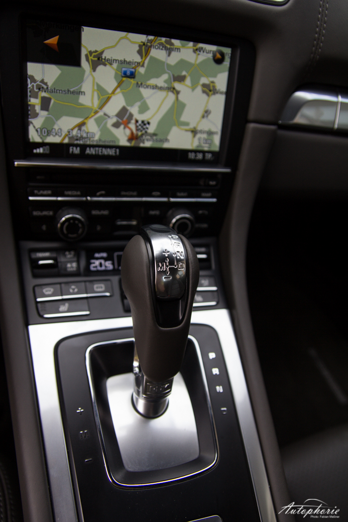 Sehr intelligent abgestimmt ist nicht nur die McPherson-Bauart entsprechende Achsaufhängung, sondern ebenso die dazugehörigen Zweirohr-Gasdruckdämpfer, die in der normalen Abstimmung schon fast Reisekomfort, wie bei einer Limousine aufkommen lassen. Auch wenn sich die 2-Wege Sportsitze Plus nur bedingt verstellen lassen, bieten sie angenehmen Komfort, ihre wahre Vorliebe gilt aber der Kurvenhatz. Bevor diese beginnen kann steht meist eine lange Anreise bevor, die im Prinzip kein Problem darstellt, bei im Tempomat eingestellten 125 km/h begnügt sich der Boxermotor auf der „Rückbank“ mit sagenhaften 6,7 Liter auf 100 Kilometern. Nebenbei erwähnenswert, ist der Tempomat der cleverste, der mir je untergekommen ist. Bei Gefälle (Auto wird logischerweise schneller) bremst er nicht ab, sondern schaltet die Gänge herunter. Genauso, wenn am Wahlhebel die Geschwindigkeit verringert wird, bleibt der Anker an der Kette und es wird stattdessen ein bis zwei Gänge heruntergeschaltet bis die gewünschte Geschwindigkeit erreicht ist und der sparsame siebte Gang des PDK mit einer langen Übersetzung von 0,62 eingelegt werden kann.