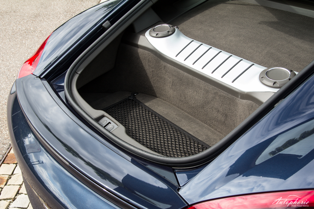 Praktikabel, warum, es ist doch ein Porsche, da hat das Wort „praktisch“ keinerlei Daseinsberechtigung. Insofern auch der Cayman ein reiner Zweisitzer ist – hinter den Sitzen ist wirklich kein Platz mehr, außer für einen kleinen Ordner – besitzt er die Möglichkeit vorne sowie auch hinten Gepäck unter zubringen. Wer hierbei mit dem Mittelmotor-Sportler auf Zeitenjagd gehen will, kann dabei auch gleich die präferierte Gewichtsverteilung anpassen. Vorne 150 Liter – direkt auf der Vorderachse – und hinten sogar 162 Liter Gepäck, die sich dort verstauen lassen.