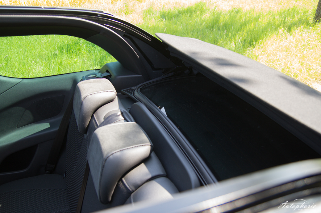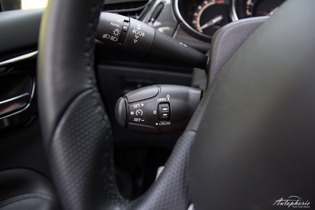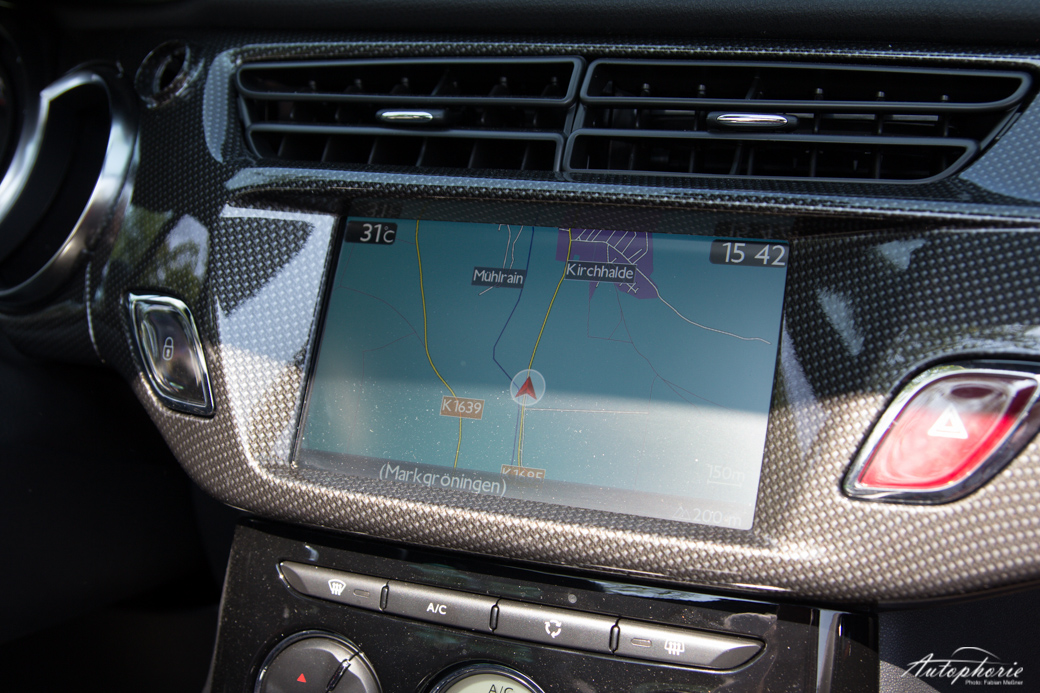 Das Lenkrad mit geschwindigkeitsabhängiger Lenkunterstützung ist dabei frei von Knöpfen oder Multifunktionsmist. Dieser ist clever an die Lenkachse hinter den Lenkkranz gepackt, wo sich unter anderem die Wahlhebel für Scheibenwischer und Blinker wie auch die Bedieneinheiten für den Tempomat, sowie die Radio/Musik-Steuerung befinden. Die Bedienung des Infotainment-Systems ist zu Beginn, auch wenn lange kein Citroën gefahren wurde, recht kniffelig, da alles über einen kleinen Drehknopf gesteuert wird. Eigentlich braucht es zusätzliches Training bis es ohne weitere Probleme klappt. In den Gängen 1,3 und 5 kann zumindest die Hand auf der Gangschaltung abgelegt werden und gemütlich am Rad gedreht werden. Positiv überrascht war ich von der Darstellung des Navigationssystems, dass in eben solcher auch gerne überholt werden darf (teilweise auch sehr späte Richtungsansagen), bei direkter Sonneneinstrahlung (von hinten durch das geöffnete Verdeck) noch immer abzulesen war – anders als das Infodisplay in der Tachoeinheit, welches wie weggezaubert war.