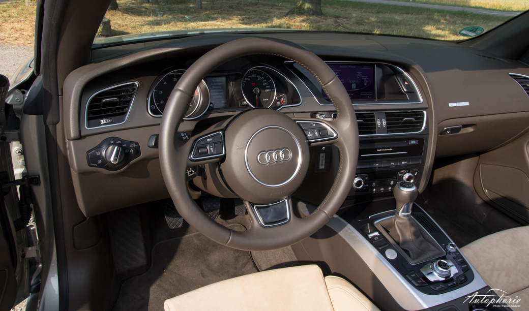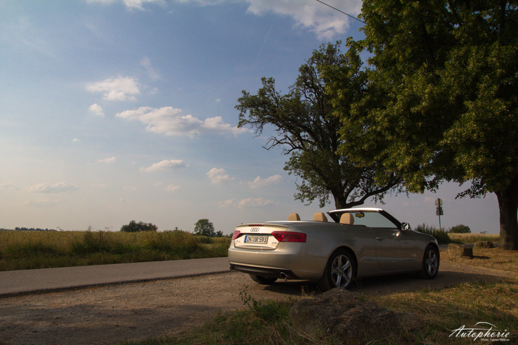 Kritik muss sich der Motor hingegen gefallen lassen. Auch schon bei einer Mietwagenfahrt mit dem Audi A4 (B8) enttäuschte der 1.8 TFSI doch eher als das er begeisterte. Wer nicht vorher das Datenblatt gelesen hat, kauft dem Motor die angeblichen 170 PS niemals ab, was Selbstversuche innerhalb der Autophorie-Redaktion bewiesen: „Geschätzt, vielleicht so um die 110, 120 PS“. Ganz zu schweigen vom Drehmoment, welches 320 Nm betragen soll. Was ein offizieller Prüfstand-Lauf wohl ausgeben würde? Immerhin eines muss man ihm lassen: In der Effizienz ist er, zumindest bei Normalfahrt, genügsam und weicht nur geringfügig vom Normverbrauch im Drittelmix ab (Werksangabe: 6,2 Liter; getestet 6,5 Liter / 100 km). Den guten Wert bestätigt auch die Erfüllung der strengen EURO 6 Abgasnorm. Stehen bleibt das Cruiser-Image mit dem Motor noch deutlicher als mit jedem anderen. Teurer als die Einstiegsmotorisierung, dennoch eine Empfehlung wert (weil auch noch immer die EURO 6 Norm eingehalten wird), ist der 2.0 TFSI mit 225 PS Leistung. Das hohe Gewicht (1695 Kilogramm leer) macht dem Motor eindeutig zu schaffen. So bereitet alles, was nach dem dritten Gang kommt, keine „Freude am Fahren“ mehr. Er bleibt der Cruiser und nicht der Herr der linken Spur (dafür gibt es die Variante RS5) – auch mit Stoffverdeck.
