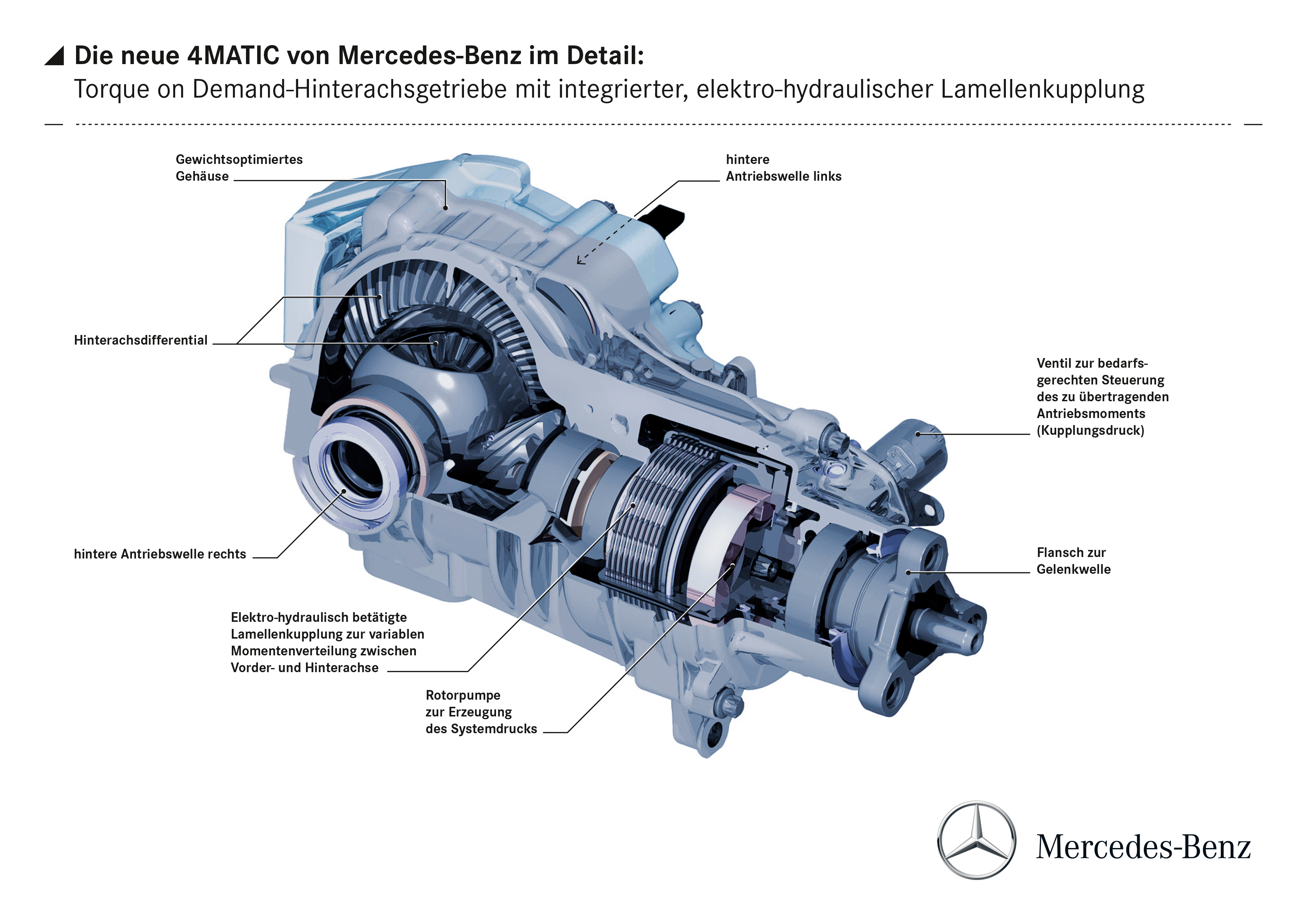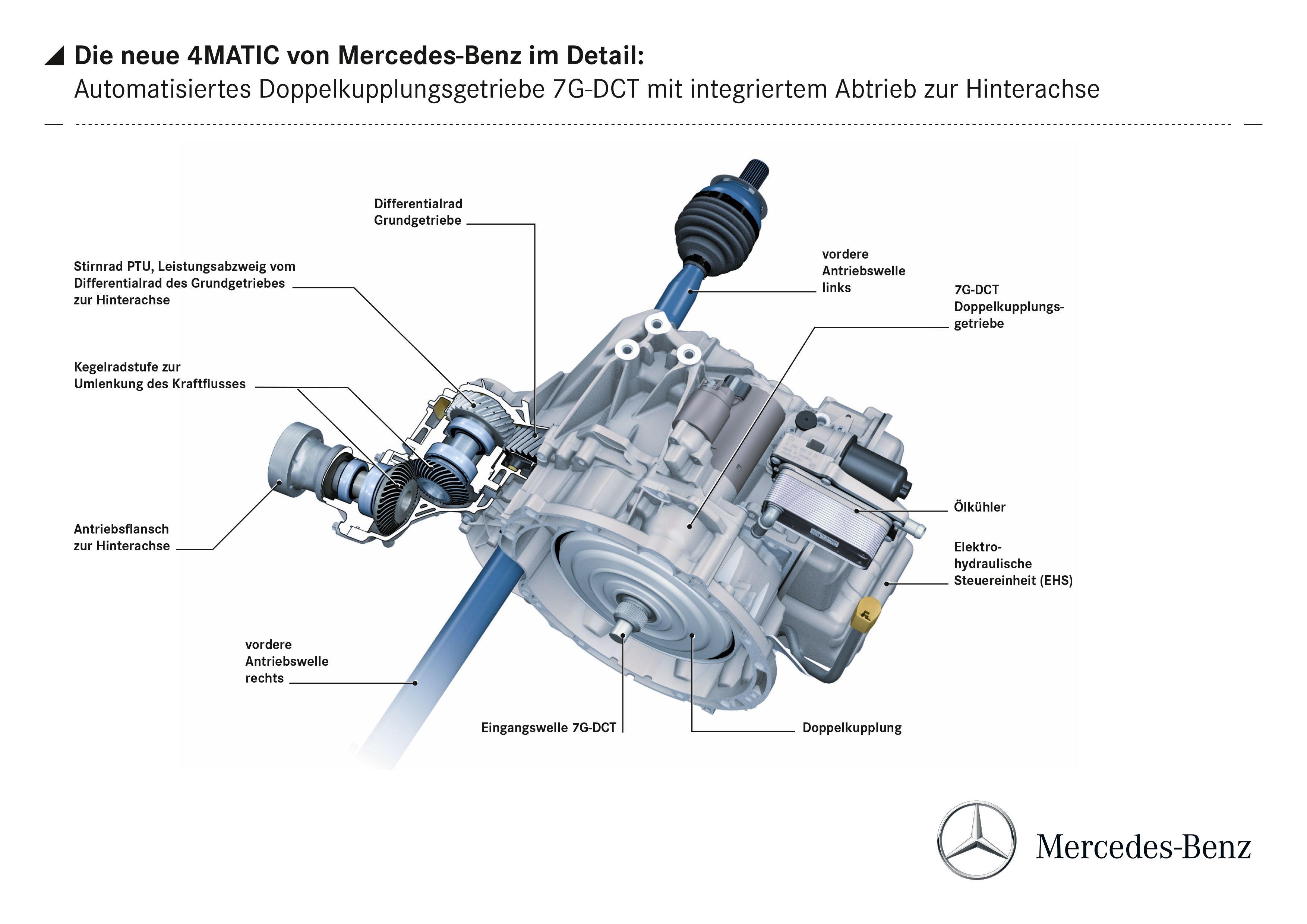 Die Power Take-Off Unit (PTU), die dafür sogar, dass bei Bedarf auch die hinteren Räder mit Momenten versorgt werden, ist Platz sparend im Gehäuse des 7G-DCT untergebracht. Wie bereits erwähnt, können die Momente im Extremfall sogar bis 100% nach hinten verteilt werden. Der optimale Fall ist allerdings eine maximale Verteilung von 50:50 von Vorder- zu Hinterachse. Dies funktioniert durch die in das Hinterachsgetriebe integrierte Lamellenkupplung. Ist sie geöffnet, werden nur die vorderen Räder angetrieben. Wird sie geschlossen, werden auch Momente an die hinteren Räder weitergegeben. Auch die Fahrprofile tragen zur Verteilung bei: In Eco wird bspw. eher selten der verfügbare „Heckantrieb“ genutzt. Erst im Sport-Modus wird die Reaktionszeit der Gerotorpumpe verkürzt und das Moment schneller an die Hinterräder verteilt.