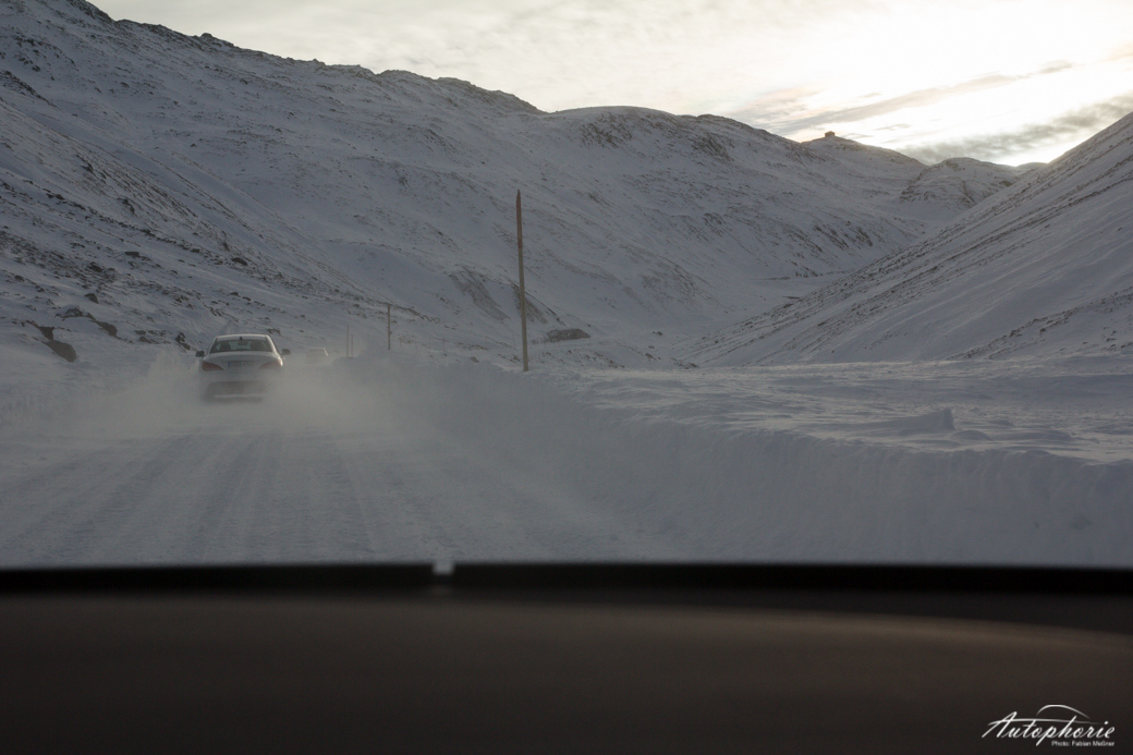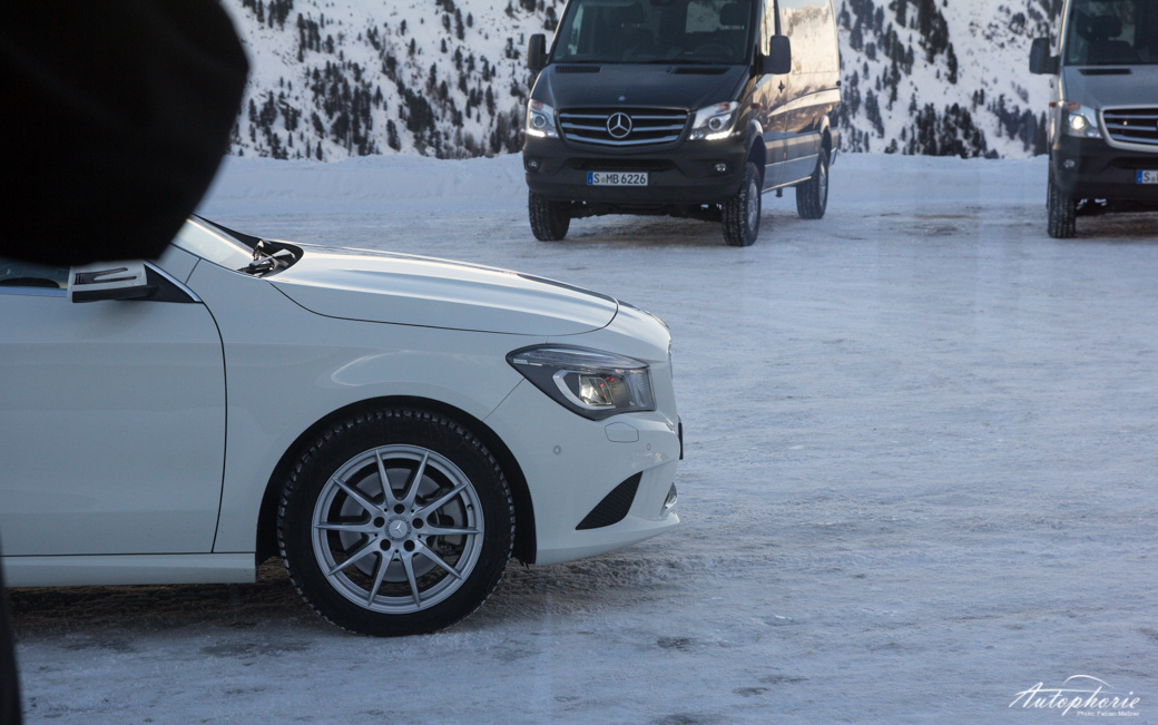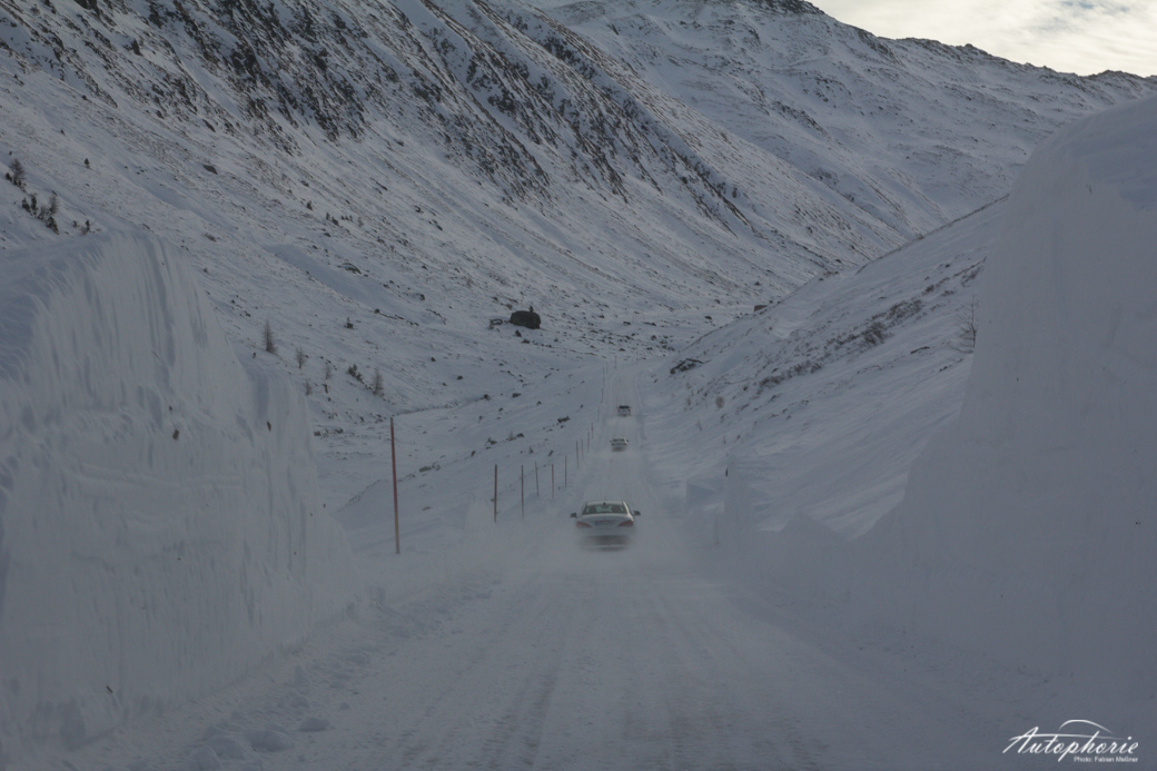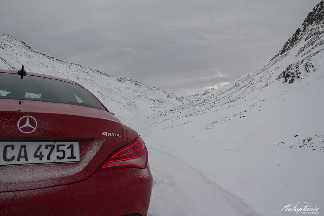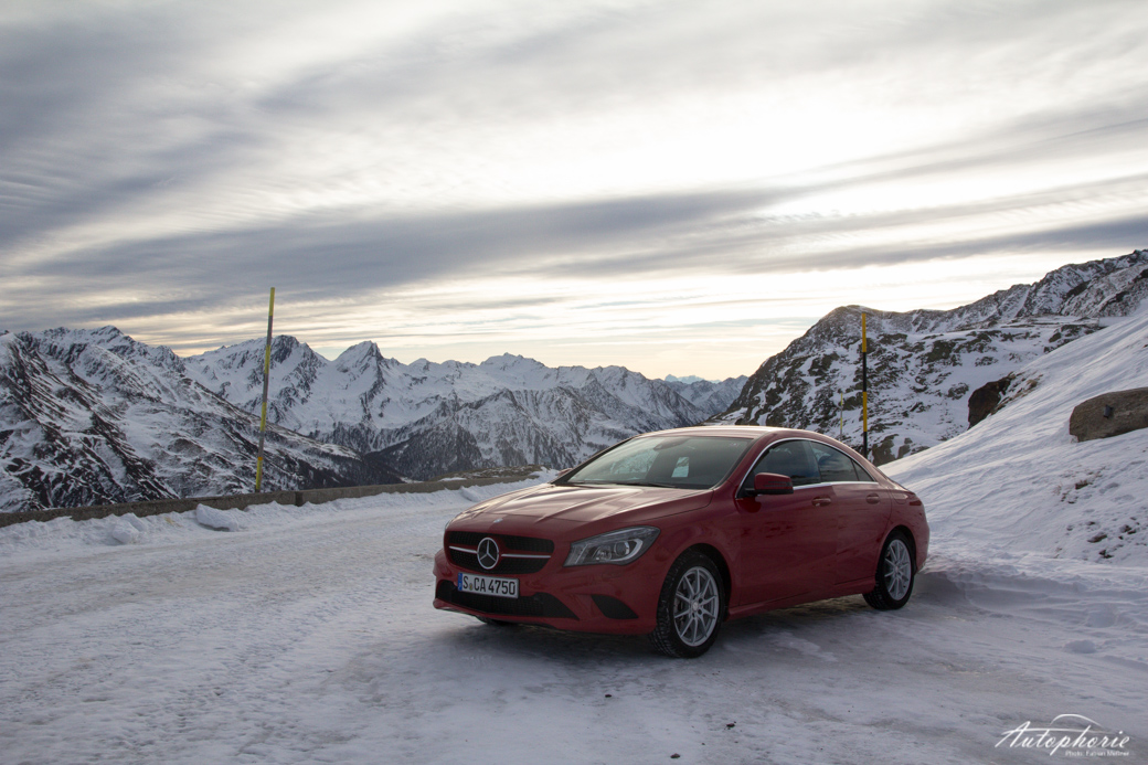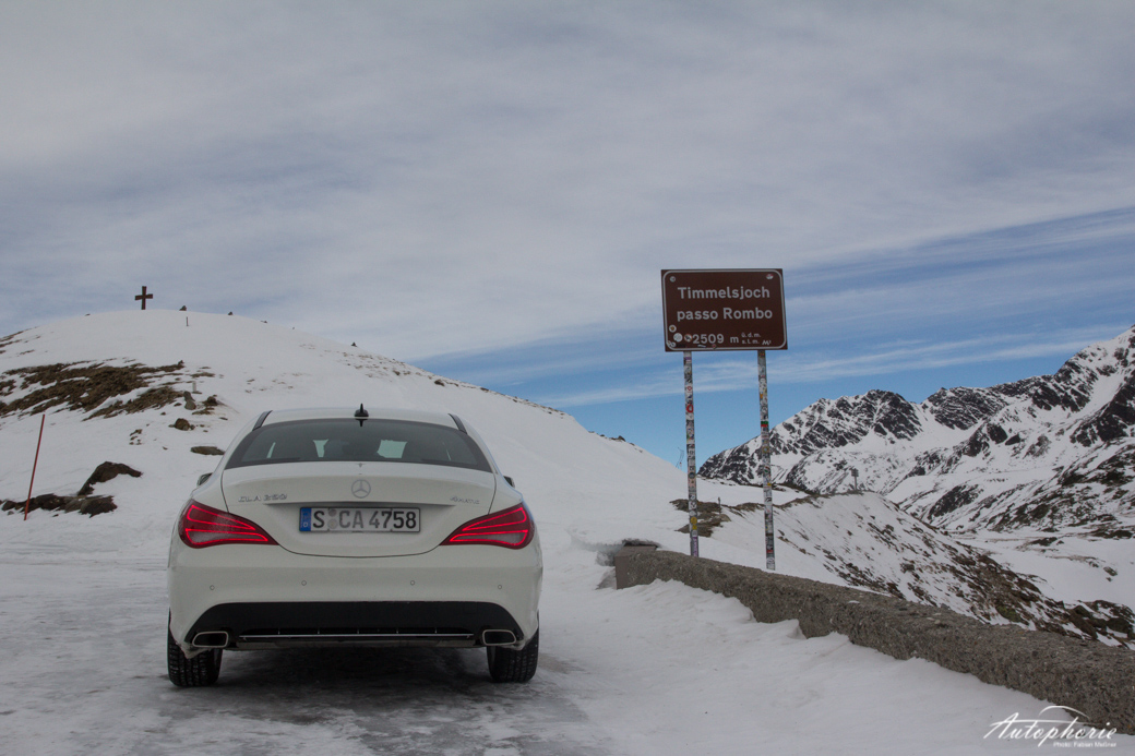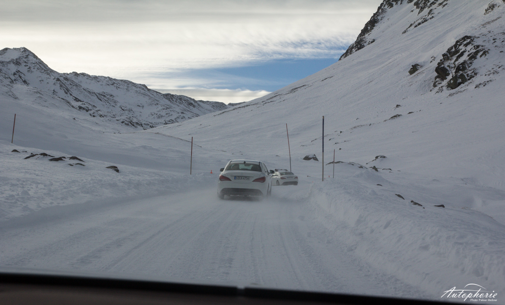 Die ersten Kurven sind spannend; weniger wegen der schneebedeckten Eisfläche, sondern wegen dem Abgrund von über 1000 Metern. Also nur nichts überstürzen auf den ersten Meter. Die Passstraße, die uns über die insgesamt sieben Kilometer immer wieder rauf und runter führt, zieht sich zwischen den Gebirgsketten durch und steigt dann in scharfen Haarnadelkurven weiter auf 2474 m Ü.A. Höhenmeter hinauf. Auf gerader Fläche durften wir dann auch mal hintereinander „herfliegen“ – nicht schlecht, wenn ein CLA 140 bis 150 km/h auf Schnee und Eis „rennt“ und sich dann auch wieder einbremsen lässt. Wenn auch gleich die Serpentinen auf der italienischen Seite die schöneren sind, hatten wir auf der österreichischen Seite eine geräumte Fläche aus Schnee und Eis. Irgendwo zwischen meterhohen Wällen aus Schnee, die harte Eis-Bremsklötze sind, sollte man die Kurve doch mal verpassen.