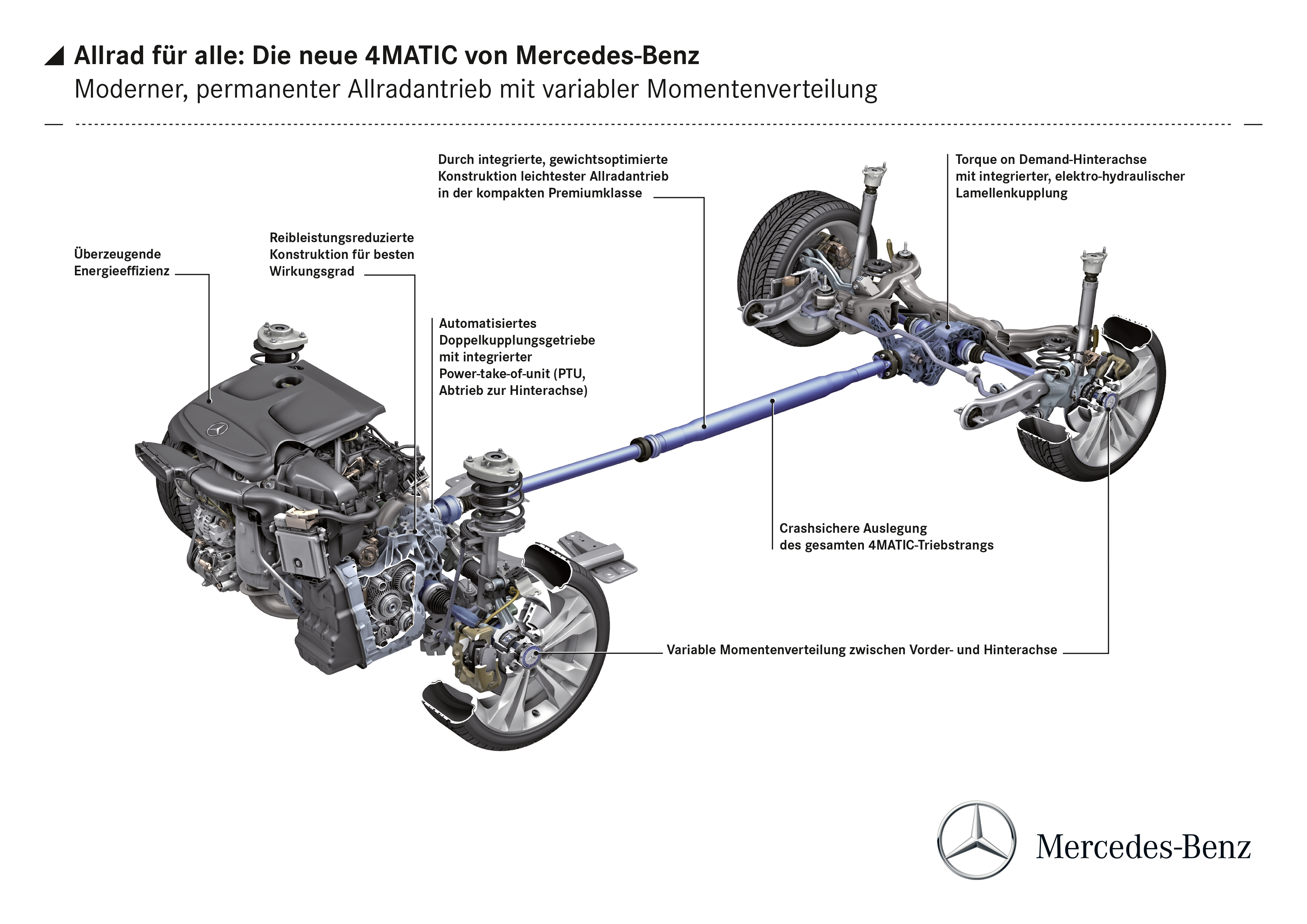 Die Power Take-Off Unit (PTU), die dafür sogar, dass bei Bedarf auch die hinteren Räder mit Momenten versorgt werden, ist Platz sparend im Gehäuse des 7G-DCT untergebracht. Wie bereits erwähnt, können die Momente im Extremfall sogar bis 100% nach hinten verteilt werden. Der optimale Fall ist allerdings eine maximale Verteilung von 50:50 von Vorder- zu Hinterachse. Dies funktioniert durch die in das Hinterachsgetriebe integrierte Lamellenkupplung. Ist sie geöffnet, werden nur die vorderen Räder angetrieben. Wird sie geschlossen, werden auch Momente an die hinteren Räder weitergegeben. Auch die Fahrprofile tragen zur Verteilung bei: In Eco wird bspw. eher selten der verfügbare „Heckantrieb“ genutzt. Erst im Sport-Modus wird die Reaktionszeit der Gerotorpumpe verkürzt und das Moment schneller an die Hinterräder verteilt.