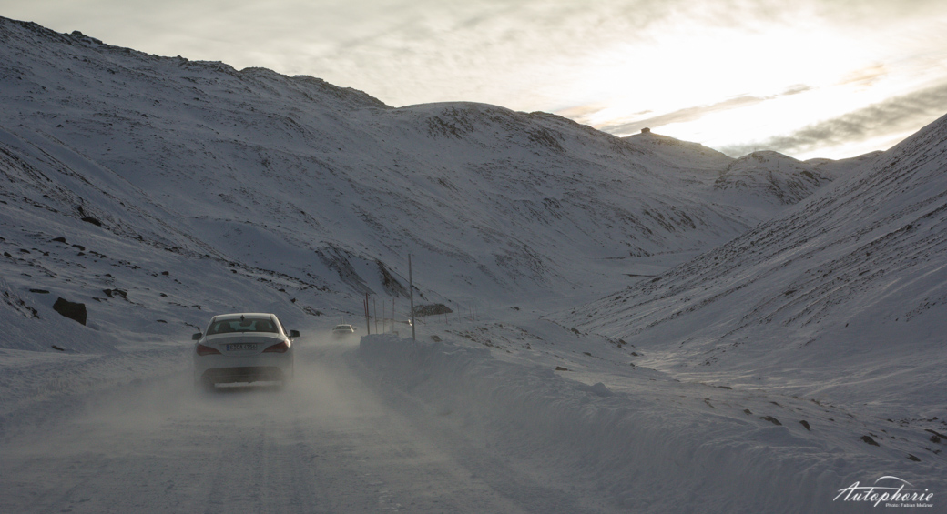 Die ersten Kurven sind spannend; weniger wegen der schneebedeckten Eisfläche, sondern wegen dem Abgrund von über 1000 Metern. Also nur nichts überstürzen auf den ersten Meter. Die Passstraße, die uns über die insgesamt sieben Kilometer immer wieder rauf und runter führt, zieht sich zwischen den Gebirgsketten durch und steigt dann in scharfen Haarnadelkurven weiter auf 2474 m Ü.A. Höhenmeter hinauf. Auf gerader Fläche durften wir dann auch mal hintereinander „herfliegen“ – nicht schlecht, wenn ein CLA 140 bis 150 km/h auf Schnee und Eis „rennt“ und sich dann auch wieder einbremsen lässt. Wenn auch gleich die Serpentinen auf der italienischen Seite die schöneren sind, hatten wir auf der österreichischen Seite eine geräumte Fläche aus Schnee und Eis. Irgendwo zwischen meterhohen Wällen aus Schnee, die harte Eis-Bremsklötze sind, sollte man die Kurve doch mal verpassen.