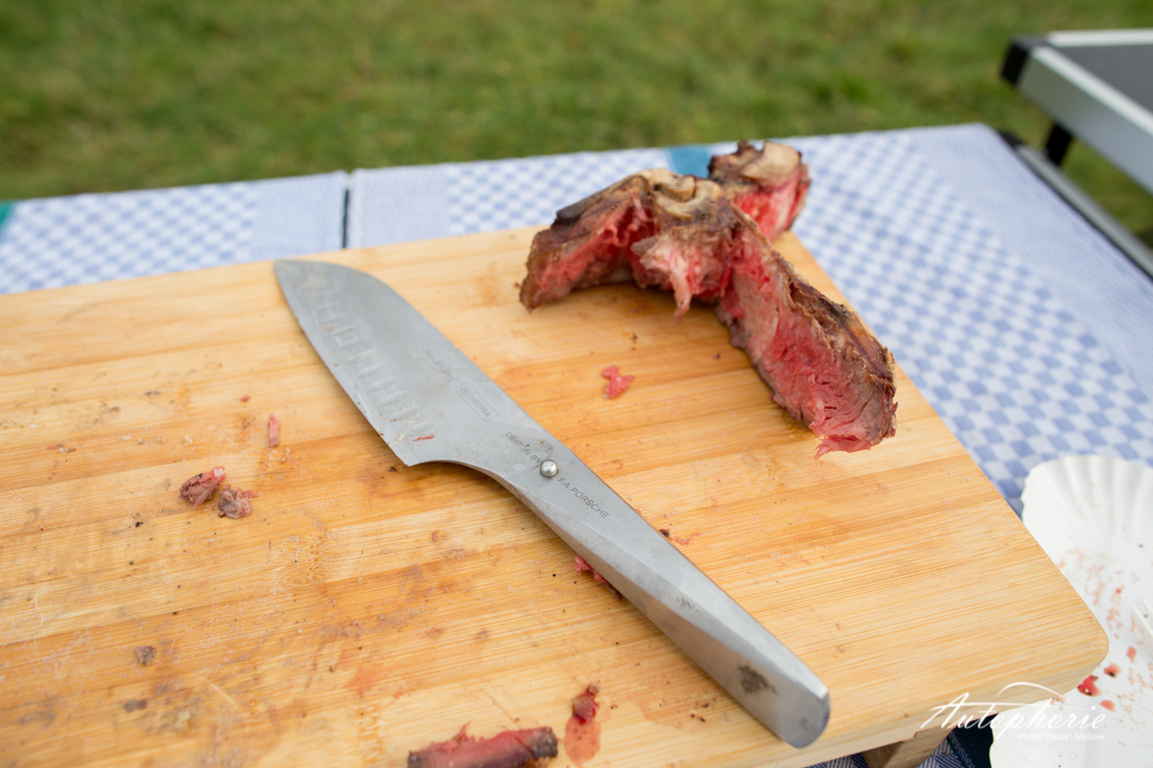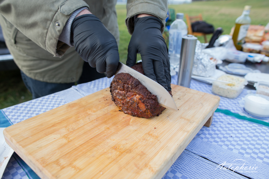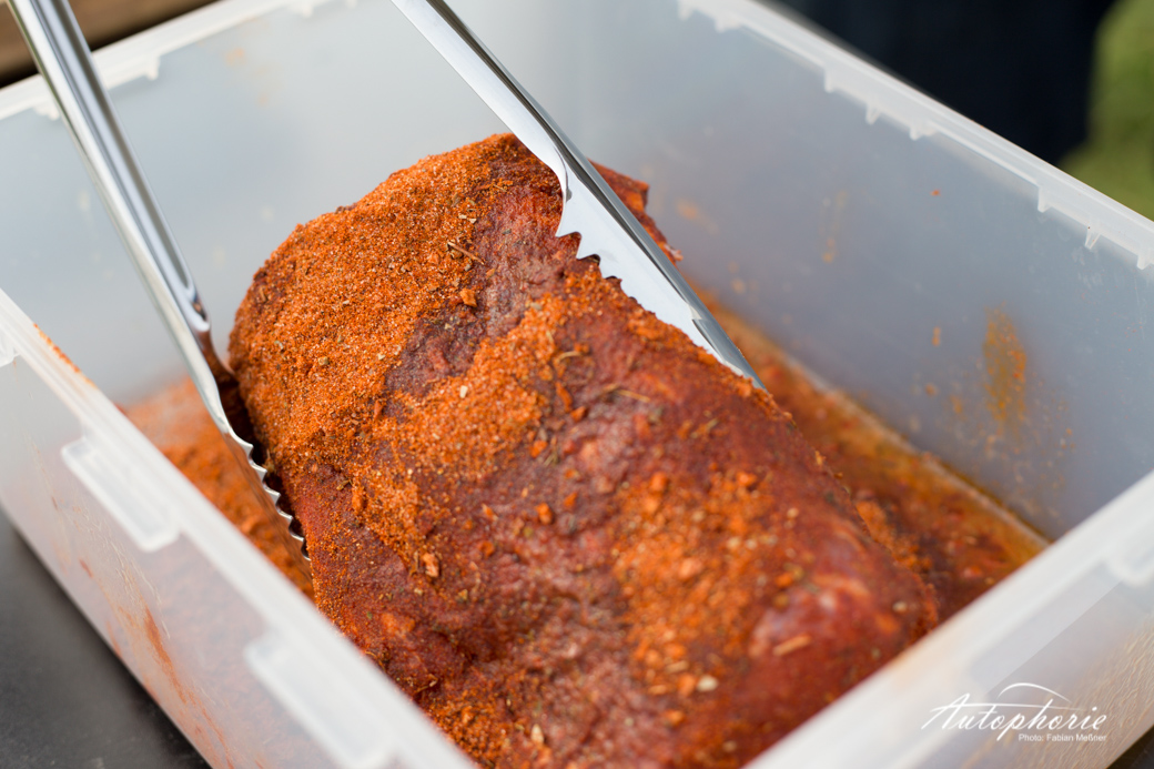 Pur, unverändert und natürlich kam das T-Bone Steak in seiner vollen Pracht in den zweiten Weber Grill, auch hier wurde immer wieder die Temperatur kontrolliert. Parallel schnitt Martin schon die Steaks vom Rückenstück herunter. Die dicke Fettschicht erschreckt vorerst im unzubereiteten Zustand, doch es muss so viel sein. Der Geschmacksträger überzeugte sogar die Frau im BBQ-Team. Im Verhältnis zu den anderen Stücken nur kurz von beiden Seiten angegrillt und direkt verkostet. Endlich gab es nach circa zwei Stunden warten etwas zu essen. Da hätte wahrscheinlich alles geschmeckt. Doch wir hatten hier schon fast extravagantes Fleisch zu bezahlbaren Preisen. Eine Kreuzung aus dem Iberico und dem Schwäbischhallischem Schwein. Beide Arten sind für ihren hohen Fettrücken bekannt und geschätzt, wir wissen nun auch warum. Egal ob total ungewürzt, mit Pfeffer oder Salz mit leichter Chilli-Würze. Auch mit den etwas schärferen Saucen. Lecker! Egal wie, das ist nicht nur einfach mal eben Würstchen auf den Grill und fertig. „Low and slow“, eine Grillart, die in Deutschland viel zu wenig geschätzt wird.
