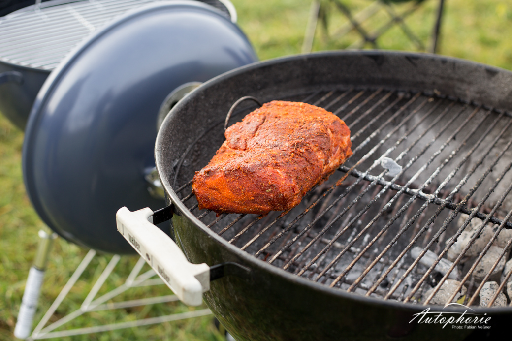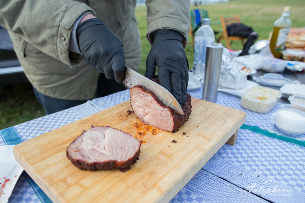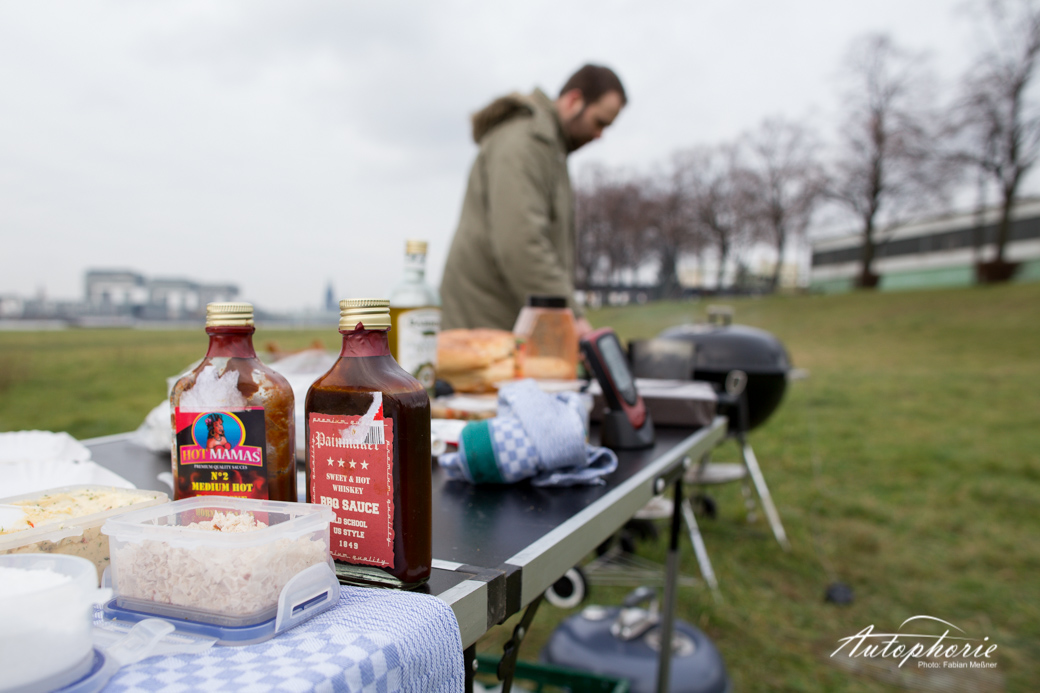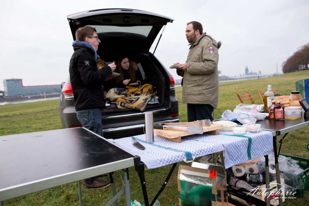 Im Kölner Süden trafen wir auf unseren heutigen Koch, wenn nicht gar den Grillmaster aus Köln – zumindest in meinen Augen. Der Initiator des #meatup_cgn stand schon lange auf meiner „To-meet -Liste“. Bald über ein Jahr verfolgte ich die Kochkünste von Martin Block auf Twitter und Instagram. Ihm erging es fast gleich, mir lief der Saft im Mund zusammen während er sich die Finger nach den schönen Karossen leckte. Es war an uns das Thema Fleisch und Automobil endlich zu verbinden und wo geht das besser, als bei einem Barbecue mit zwei Weber Grills, einem der männlichsten Autos, die die Welt zu bieten hat und das direkt am Rhein an den Poller Wiesen?