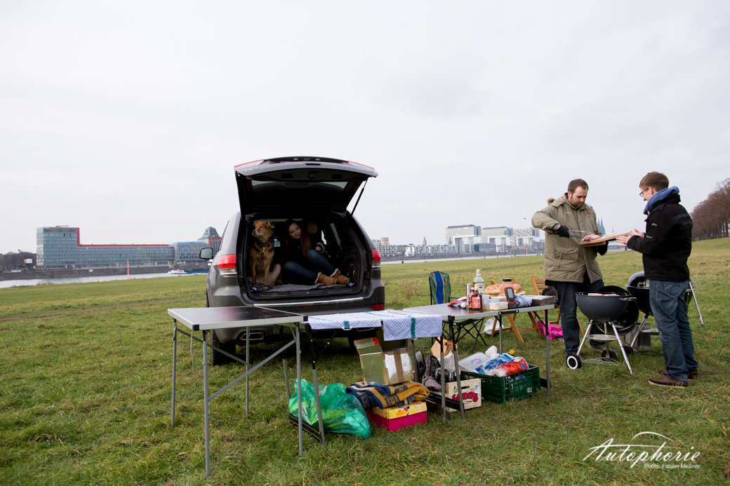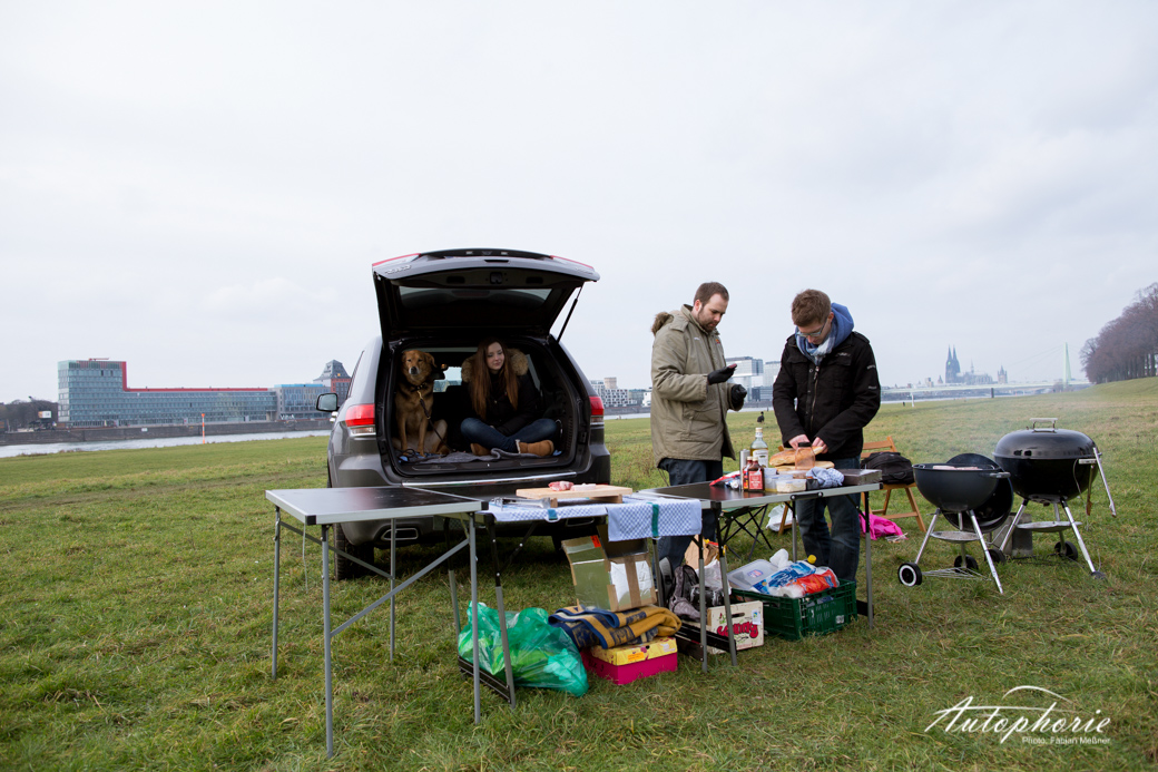 Geradeso ging alles in den Jeep, der mit jedem Modellwechsel immer kleiner wird, doch schlussendlich hatten beide Grills, drei Tische plus Stühle, alle Zutaten, drei hungrige sowie ein Hund im Jeep Grand Cherokee Platz genommen. Noch eben schnell frisches, selbstgemachtes Brot beim Türken um die Ecke geholt und es kann die Fahrt zum Rhein beginnen. Wie wir aber auch später feststellten, so viel Brot hätten wir gar nicht benötigt, denn dieses Fleisch ging runter wie Öl. Ganz ohne Beilagen.