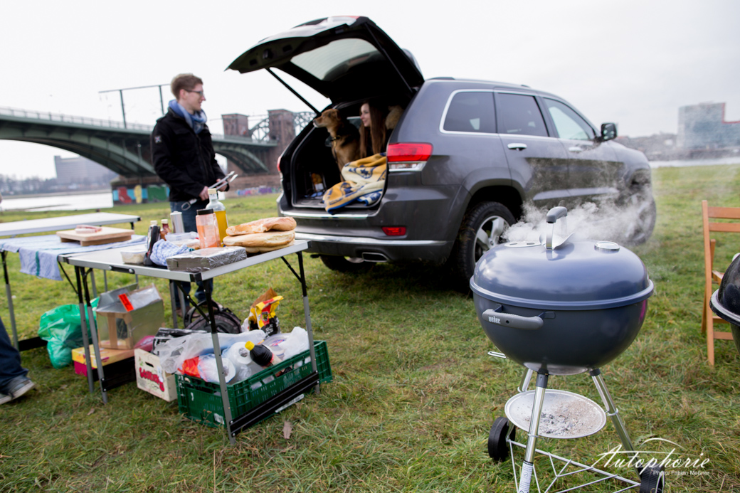 Jeep. Deftige Fleisch Portionen. BBQ an der frischen Luft. Direkt am Rhein. Das passt zusammen. Das lohnt sich. Das muss Mann gemacht haben.
