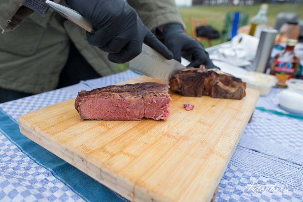 Ein männlicher Tag bei Temperaturen um den Gefrierpunkt. Wobei nicht ganz männlich, eine weibliche Spionin hat sich unter das wohl ausgesuchte Volk gemischt, um die Flagge für das dem Fleisch abgeneigte Geschlecht hochzuhalten – die Überzeugung folgte sogleich. Ein T-Bone Steak, Steaks vom Stauferico Rücken sowie eine Geschmacksexplosion, auch dank des „Butt Glitter Rub“, in Form des Stauferico Hals Stücks. Mehr als vier Kilogramm Fleisch an denen wir uns nähren konnten, während dem Jeep drei kleine 5 Liter Fässchen für die flotte Fahrt nach Köln genügten.