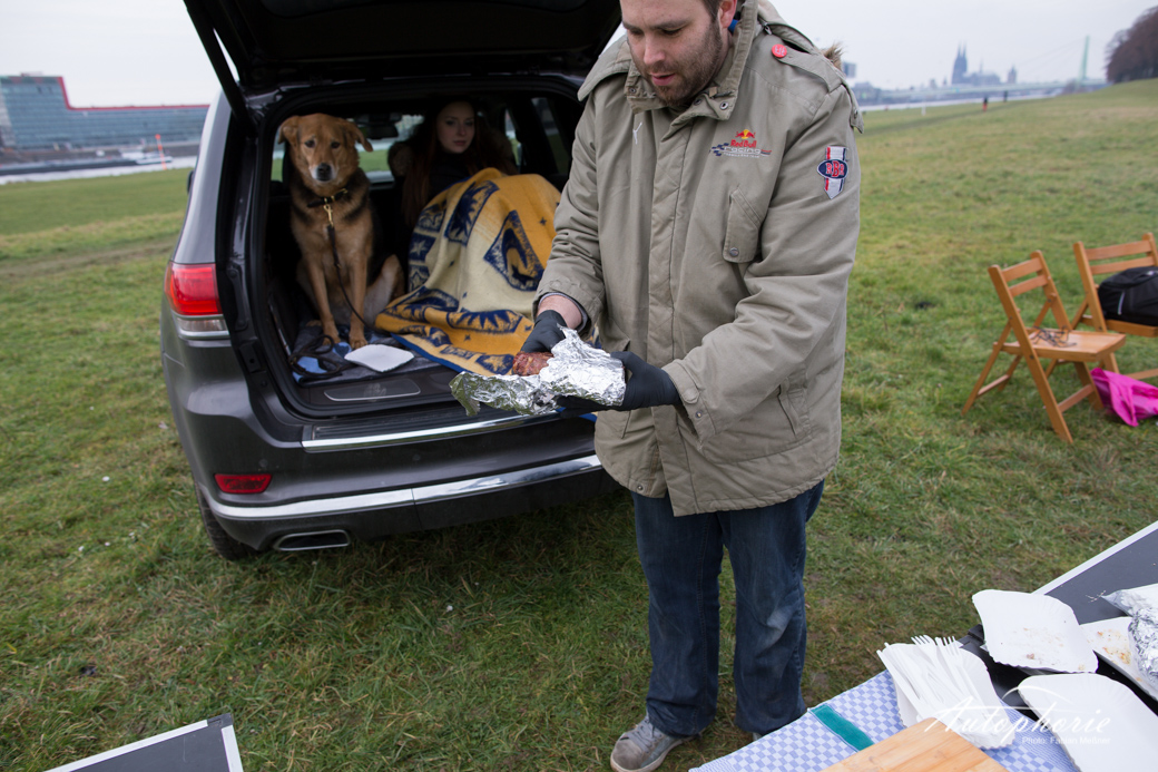 Jeep. Deftige Fleisch Portionen. BBQ an der frischen Luft. Direkt am Rhein. Das passt zusammen. Das lohnt sich. Das muss Mann gemacht haben.