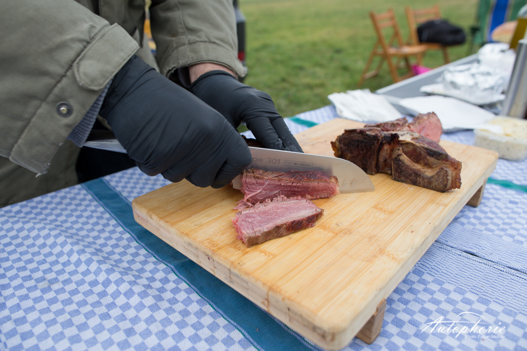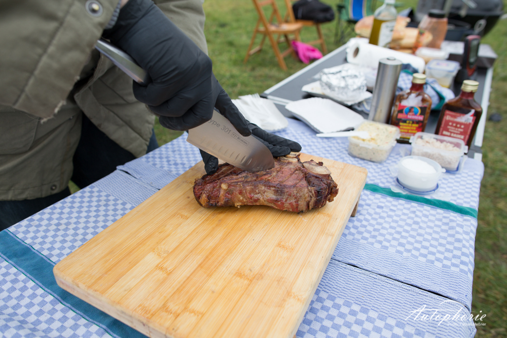 Ein männlicher Tag bei Temperaturen um den Gefrierpunkt. Wobei nicht ganz männlich, eine weibliche Spionin hat sich unter das wohl ausgesuchte Volk gemischt, um die Flagge für das dem Fleisch abgeneigte Geschlecht hochzuhalten – die Überzeugung folgte sogleich. Ein T-Bone Steak, Steaks vom Stauferico Rücken sowie eine Geschmacksexplosion, auch dank des „Butt Glitter Rub“, in Form des Stauferico Hals Stücks. Mehr als vier Kilogramm Fleisch an denen wir uns nähren konnten, während dem Jeep drei kleine 5 Liter Fässchen für die flotte Fahrt nach Köln genügten.