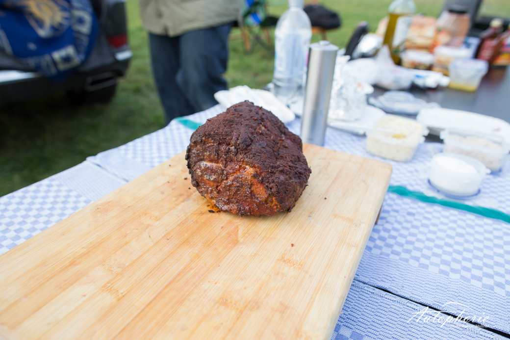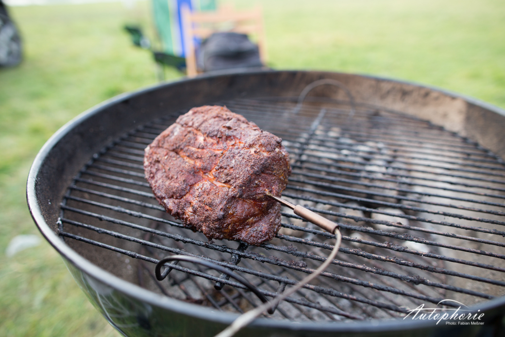 Pur, unverändert und natürlich kam das T-Bone Steak in seiner vollen Pracht in den zweiten Weber Grill, auch hier wurde immer wieder die Temperatur kontrolliert. Parallel schnitt Martin schon die Steaks vom Rückenstück herunter. Die dicke Fettschicht erschreckt vorerst im unzubereiteten Zustand, doch es muss so viel sein. Der Geschmacksträger überzeugte sogar die Frau im BBQ-Team. Im Verhältnis zu den anderen Stücken nur kurz von beiden Seiten angegrillt und direkt verkostet. Endlich gab es nach circa zwei Stunden warten etwas zu essen. Da hätte wahrscheinlich alles geschmeckt. Doch wir hatten hier schon fast extravagantes Fleisch zu bezahlbaren Preisen. Eine Kreuzung aus dem Iberico und dem Schwäbischhallischem Schwein. Beide Arten sind für ihren hohen Fettrücken bekannt und geschätzt, wir wissen nun auch warum. Egal ob total ungewürzt, mit Pfeffer oder Salz mit leichter Chilli-Würze. Auch mit den etwas schärferen Saucen. Lecker! Egal wie, das ist nicht nur einfach mal eben Würstchen auf den Grill und fertig. „Low and slow“, eine Grillart, die in Deutschland viel zu wenig geschätzt wird.