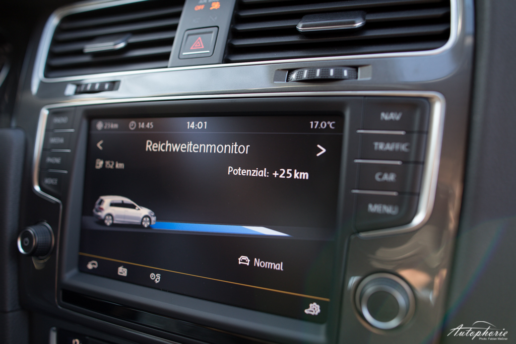 Vorher noch per App auf dem Smartphone checken, wie groß die Ladung ist bzw. diese noch ausreicht, einsteigen und losfahren. An sich nichts weiter Neues. Auto fahren ohne Geräusch und für die Stadt perfekt. Auch eben schnell auf die Autobahn macht der Strom-Wolfsburger problemlos mit. Bis zu 140 km/h sind möglich, was doch durchaus ausreicht. Der wirklich große Unterschied sind die verschiedenen Rekuperationsmodi. D1, D2, D3 und B stellen verschiedene Stärken der Energierückgewinnung* dar. Im Modus B sowie D3 müssen sogar die Bremslichter aktiviert werden, denn es werden bis zu 40 bzw. 35 kW zurückgewonnen (genaue Verzögerungswerte hierzu stehen noch aus). Unvorbereitete Beifahrer hebt dieser nicht erkennbare Bremseingriff schnell aus den Sitzen. D2 und D1 sind mit der Rekuperation bei Hybridantrieben vergleichbar, hier wird nur durch ein leichtes Bremsmanöver Energie wieder in die Batterie eingespeist. Der normale Drive Mode kommt dem Segeln gleich, fast frei von allen Kräften – abgesehen von den Reibungswerten am optimierten 205er Reifen – stoppt der e-Golf so auf gerader Fahrbahn nicht wirklich.