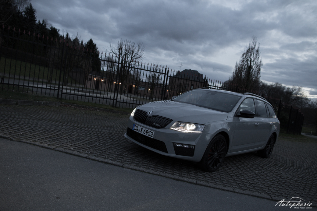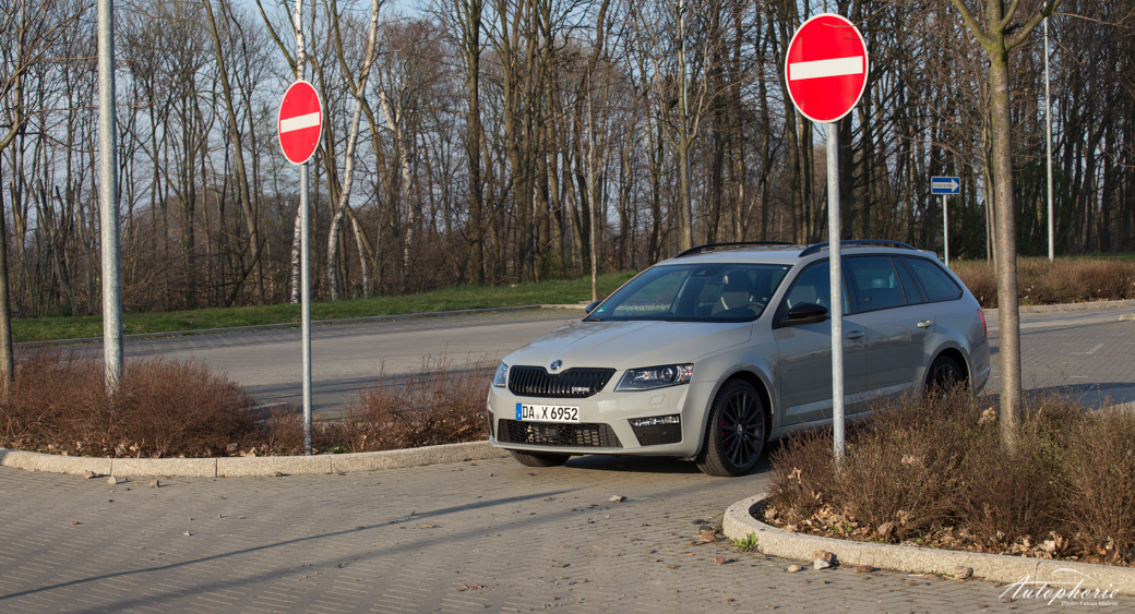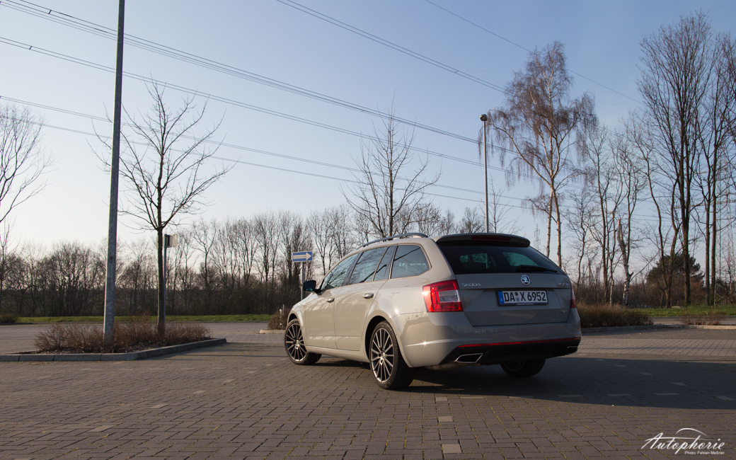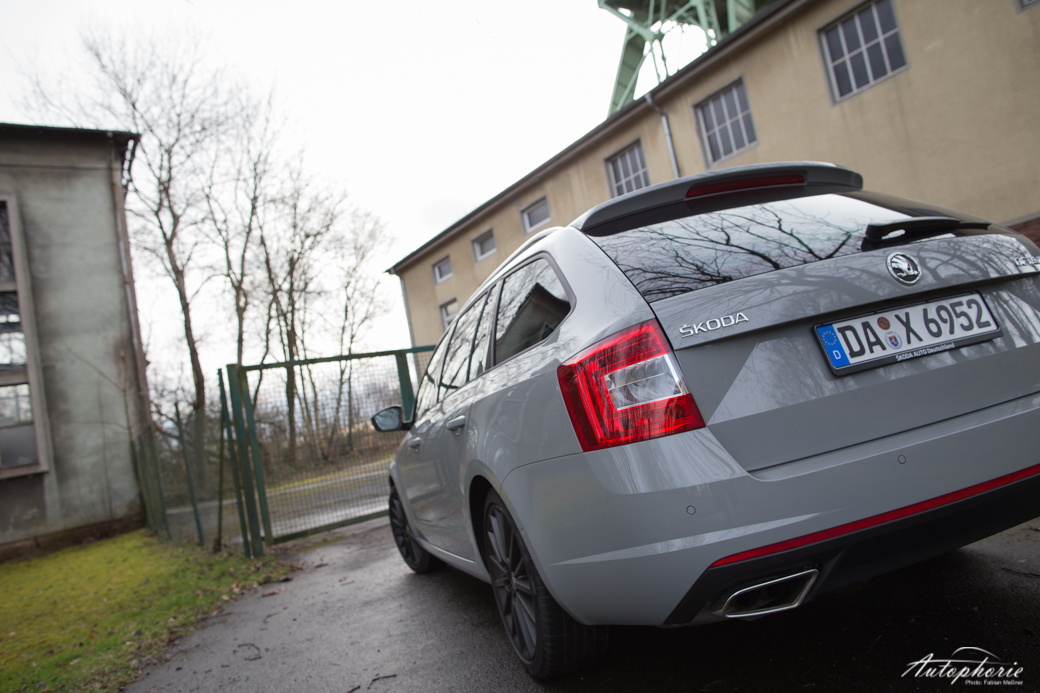 Gang rein und „S“ geht ab. Wie auch schon beim Fabia RS dreht der S-Gang weitaus weiter als wir überhaupt müssen. Gar ein Drehzahlgier-Gang, den wir hier gewählt haben. Ich brauch mehr, tritt‘ mich. Und er dreht die 184 PS auch weitaus freudiger als im D-Gang. Drive steht beim Diesel-Power-Kombi eigentlich mehr für Cruise. Nein nicht Tom Cruise sondern, „wir sind die coolsten, wenn wir cruisen“. Das in meinen Augen überzogene und nervige Fake-Geräusch des Golf GTD fehlt! Yeah! Hier darf der Diesel noch Diesel sein und muss sich nicht hinter Lautsprechern verstecken. Er darf ehrlich sein, zeigen, was er ist, auch wenn sein Kleid vielleicht erstmal so gar nicht auf einen Diesel hinweisen würde. Denn „vRS“ ist immer gleich beim Octavia. Beide Varianten zieren die ovalen Endrohre, die allerdings nur Blenden sind. Im Fall des 2.0 TDI zirkuliert auf der rechten Seite nur Luft hinter der Blende, auf der linken zeigt sich bei näherem Hinschauen die unschöne Doppelrohr-Abgasanlage. In der Bauweise macht es die Arbeit dadurch leichter, geheiratet wird eben, was gewünscht ist, doch die Außenhaut verändert sich nicht. Eine Art erweiterter Modularer Querbaukasten, wenn man so will. Auch andere Blogkollegen vertippten sich dadurch beim Erraten der Motorisierung.