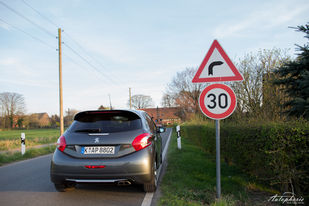 Achtung, Kurve, Tempo 30. Was hier als „gefährlich“ eingestuft wird, dass würden Rallye-Fahrer locker im vierten Gang unter Volllast nehmen. Selbst eine seichte Kurve gilt hier schon als brenzlig, warum kann ich nicht erklären. Und mitten drin stehe ich nun, mit diesem Franzosen, der weitaus mehr kann, als sein graues Äußeres vermuten lässt. Erster Gang einlegen, die Drehzahl auf 3 000 Touren erhöhen, perfekt dosiert die Kupplung kommen lassen und ab spurtet er mit leichtem Traktionsverlust an der Vorderachse. Stadtgeschwindigkeit, 6 000 Touren die maximale Power von 200 PS liegt an, zweiter Gang, der Turbo macht direkt Druck und *pling* schon ist die 100 km/h Marke erreicht. 6,8 Sekunden sind eben dahingeflogen, einzig und alleine unterbrochen von einem Gangwechsel. Dritter…nein, es bremst schon wieder das nächste Schild. Tempo 70. Warum nur?