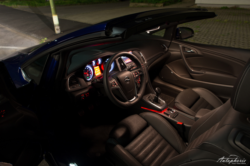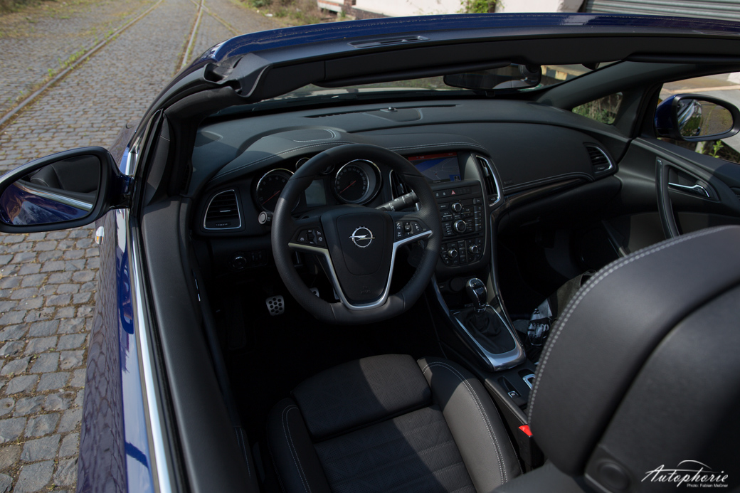 Zum einen wäre dies mitunter als „die Freiheit des Autofahrens“, dahingleiten und so weiter. Das aber meine ich nicht, denn zum anderen ist für mich auch das Fahrgefühl darunter zu verstehen. Kein straffer Komfort, sondern eher durch sanfte Wellenbewegungen federt das Viersitzer Cabrio Stöße und Unebenheiten ab. Das dicke, gar wulstige Lenkrad passt gut in das Bild eines Ami. Die Plastiklandschaft im Innenraum, das können sogar die Amis besser, aber Opel bessert aktuell doch schon nach und rüstet auf ansehnlichere Evolutionsstufen des IntelliLink um. Weniger Knöpfe = mehr Übersicht. Noch aber ist es das Navi 650, was eben zu der bekannten „oh mein Gott, welchen Knopf brauche ich nun wirklich“-Überforderungs-Starre führt.