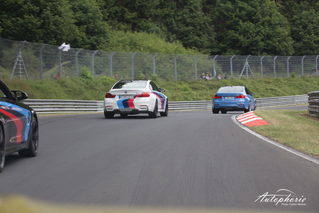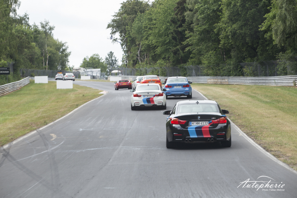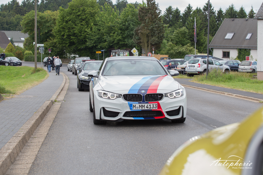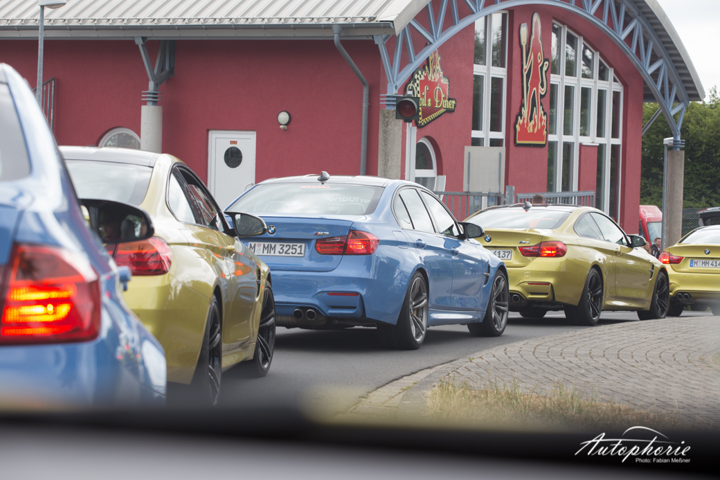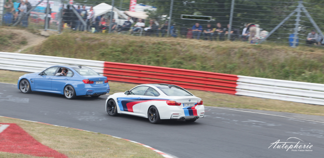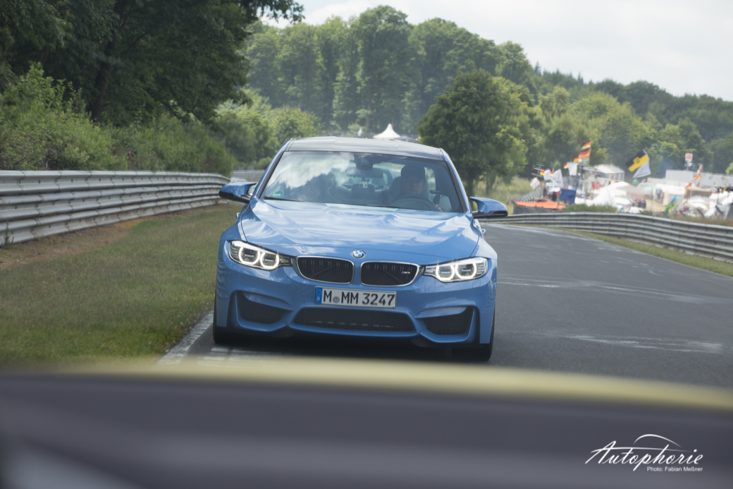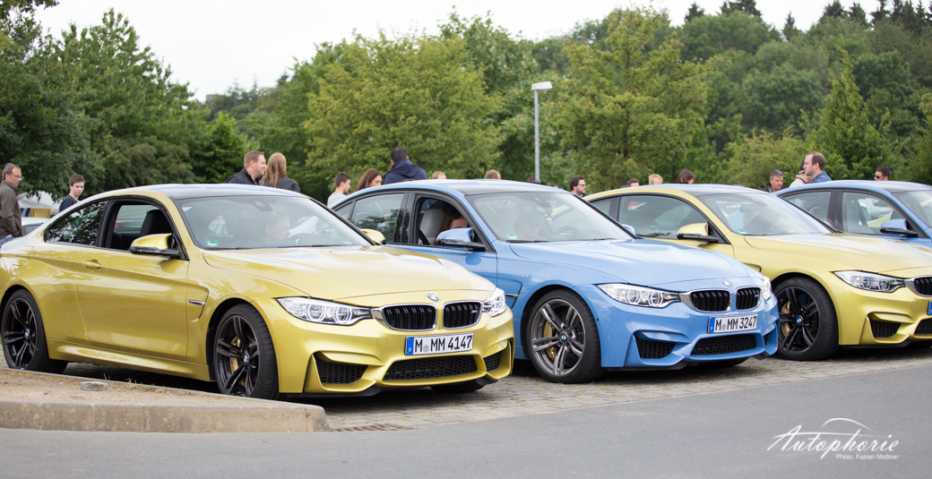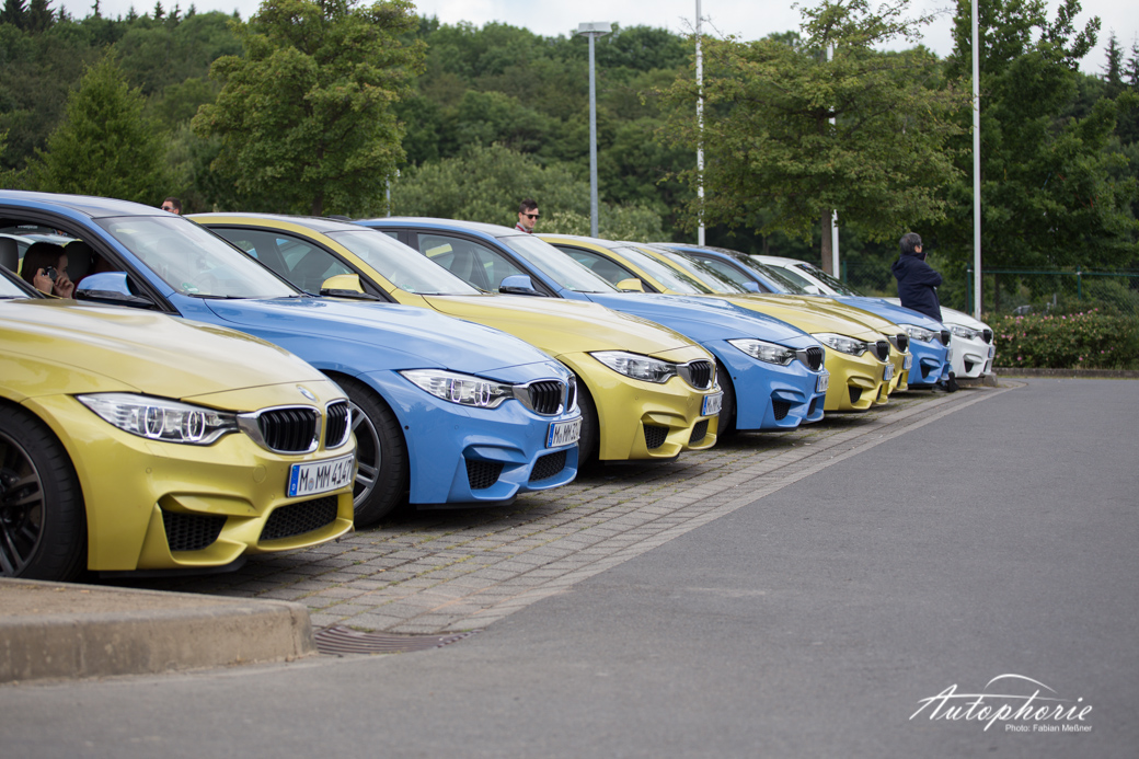 Einmal im Jahr versammel sich nicht nur viele Fans neben der Strecke, sondern auch auch auf der Strecke. Im Rahmen des M Festival von BMW, gab es insgesamt 25 Tickets für die Mitfahrt im M Korso über die Nordschleife. Mitten drin statt nur dabei die Flotte in Yas Marina Blue und Austin Yellow in Form von BMW M3 und BMW M4.