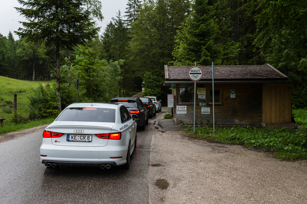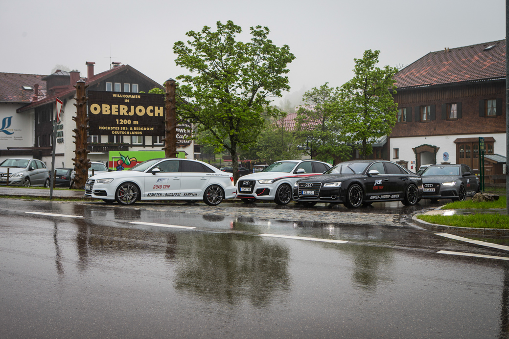 Nach entspanntem Frühstück ging es über einen kurzen Besuch bei ABT selbst direkt auf die Autobahn – noch in Kolonne – mit Ziel Oberjoch. Zum Start war uns Petrus so überhaupt nicht wohlgesonnen, denn es goss sprichwörtlich wie aus Eimern. Aber nicht die kleinen, nein aus Industrieeimern, aus solchen in denen Bier-Erzeugnisse hervorgehen. Es blieb auch den ganzen ersten Tag über regnerisch bis leicht stürmisch, da war die Stimmung aber nicht von zu trüben. Wir hatten noch einige interessante Kilometer vor uns, potente Karren unter dem Hintern und eine wild durchgemischte Truppe, die sich selbst gerne bespaßte.