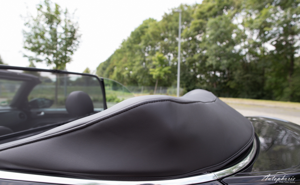Offen muss einfach die Persenning (schwarzes Leder) aufgezogen werden. Im ersten Anlauf ist es doch etwas kniffelig, sie alleine anzubringen. Eine Anleitung braucht es dafür bei gesundem Menschenverstand immerhin nicht. Die Polster unter das Verdeck drücken, damit dieses nicht auf den Lack knallen kann. Die Schutzabdeckung auf einer Seite einklinken und sich dann langsam auf die andere Seite nach vorne arbeiten. Zu zweit gelingt es deutlich fixer, wer muss, schafft es auch alleine in etwa zwei Minuten. Um die Persenning an der zweiten Verankerung festzumachen ist dann noch eben ein wenig Krafteinsatz gefragt und dann sitzt die Abdeckung. Die Heckansicht ist nun deutlich schöner als ohne.