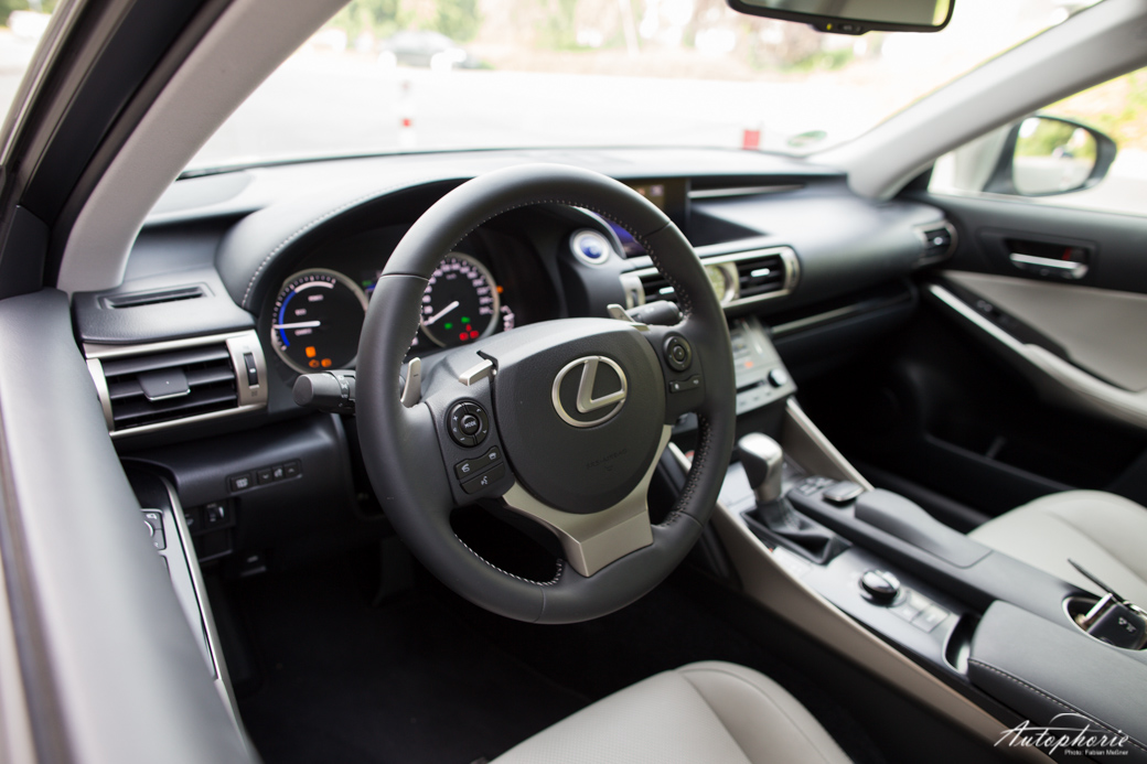Das stufenlose CVT Hybridgetriebe verfügt über eine variable Übersetzung, die an den Schaltwippen für „gefühlte“ Schaltvorgänge sorgen soll. Dies funktioniert nur bedingt. Beim „Heraufschalten“ lässt sich rein gar nichts erfühlen, von daher wird die rechte Wippe auch kaum genutzt. Die linke hingegen dient als „Rekuperationsschalter“. Beim „herunterschalten“ geht der Antrieb in die Motorbremse und rekuperiert stärker, als er es im Normalfall während des Ausrollens tun würde. Die Hybridbatterie wurde mit dem IS erstmals unterhalb des Kofferraums angeordnet. Das verleiht dem IS 300h ein athletisches Gewichtsverhältnis von 50:50.