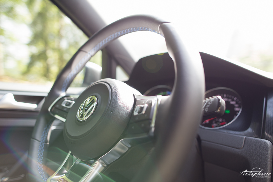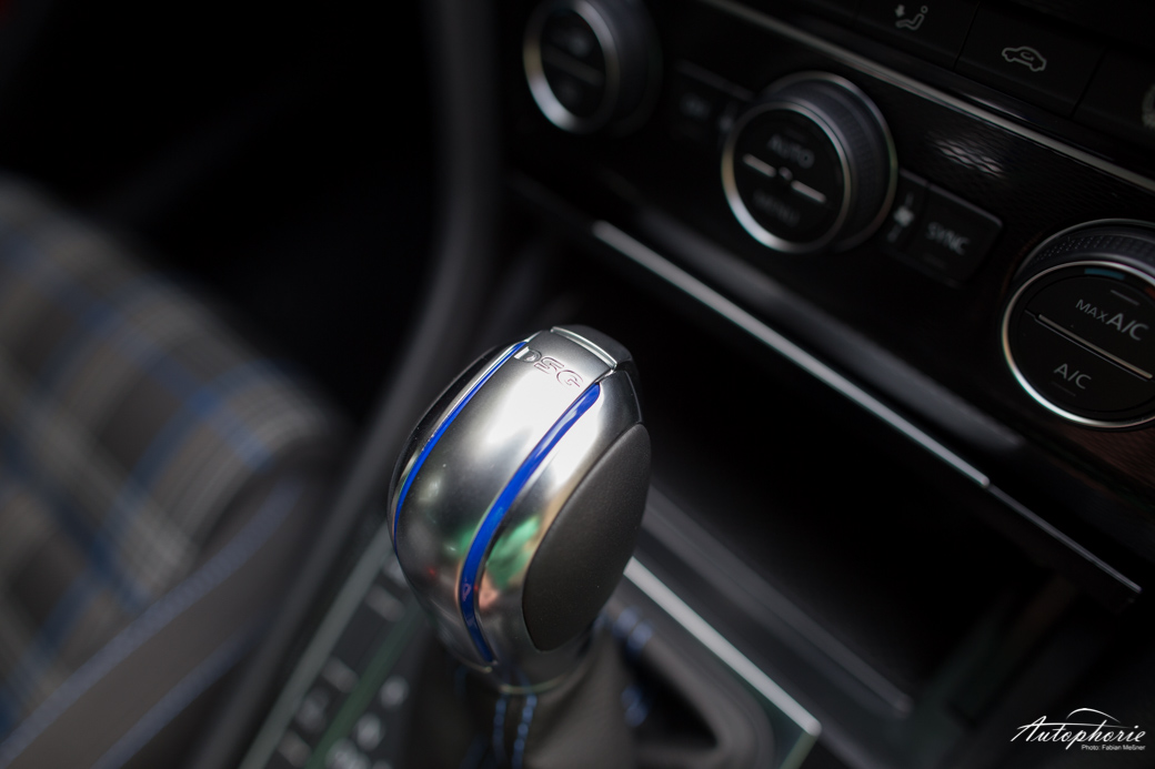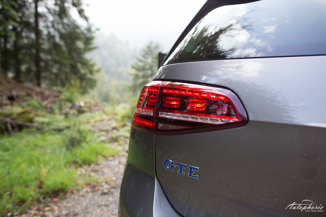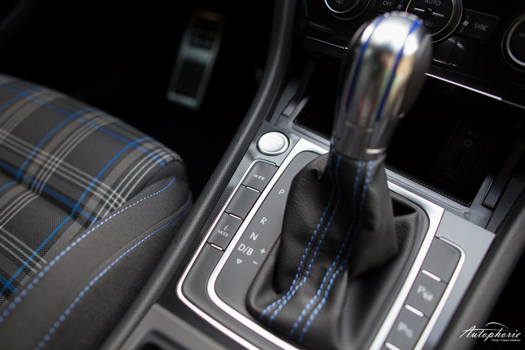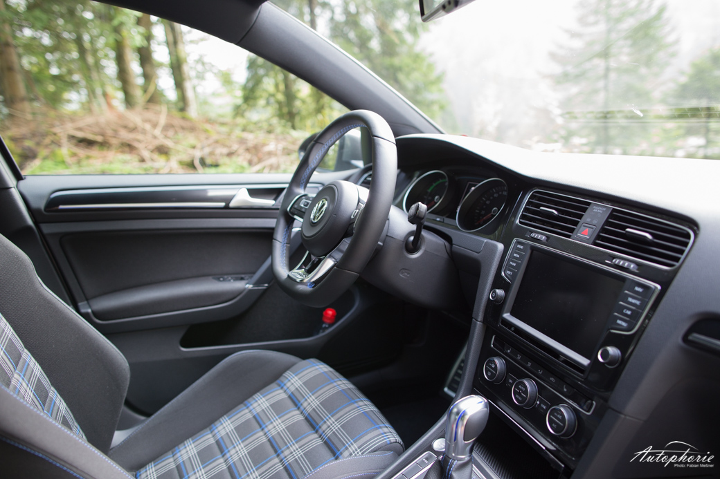 Die Grundausstattung umfasst LED-Rückleuchten, sowie LED-Scheinwerfer und 16 Zoll Leichtmetallfelgen. Wer mehr will, der muss draufzahlen und bekommt 18 Zoll Räder. Statt wie beim GTI mit rot wird beim GTE viel mit blau gespielt. Blauer Streifen im Frontgrill, blaue Streifen in den Sitzen, die an den GTI erinnern sollen. Darin gliedert sich auch die blaue Ambientebeleuchtung ein und weitere blaue Kontrastnähte „all over the place“. Pedalkappen in Edelstahl, sowie das 6,5-Zoll Touchdisplay in der Mittelkonsole gehören gleichfalls zum Serienumfang.