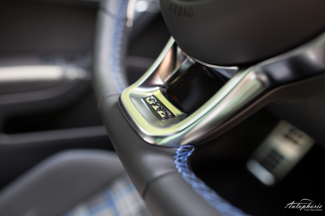 Die Grundausstattung umfasst LED-Rückleuchten, sowie LED-Scheinwerfer und 16 Zoll Leichtmetallfelgen. Wer mehr will, der muss draufzahlen und bekommt 18 Zoll Räder. Statt wie beim GTI mit rot wird beim GTE viel mit blau gespielt. Blauer Streifen im Frontgrill, blaue Streifen in den Sitzen, die an den GTI erinnern sollen. Darin gliedert sich auch die blaue Ambientebeleuchtung ein und weitere blaue Kontrastnähte „all over the place“. Pedalkappen in Edelstahl, sowie das 6,5-Zoll Touchdisplay in der Mittelkonsole gehören gleichfalls zum Serienumfang.