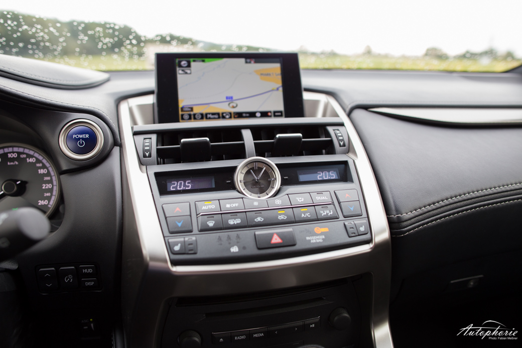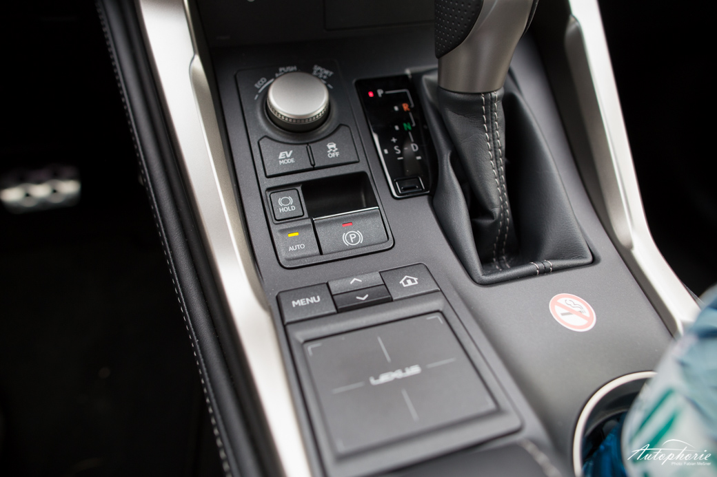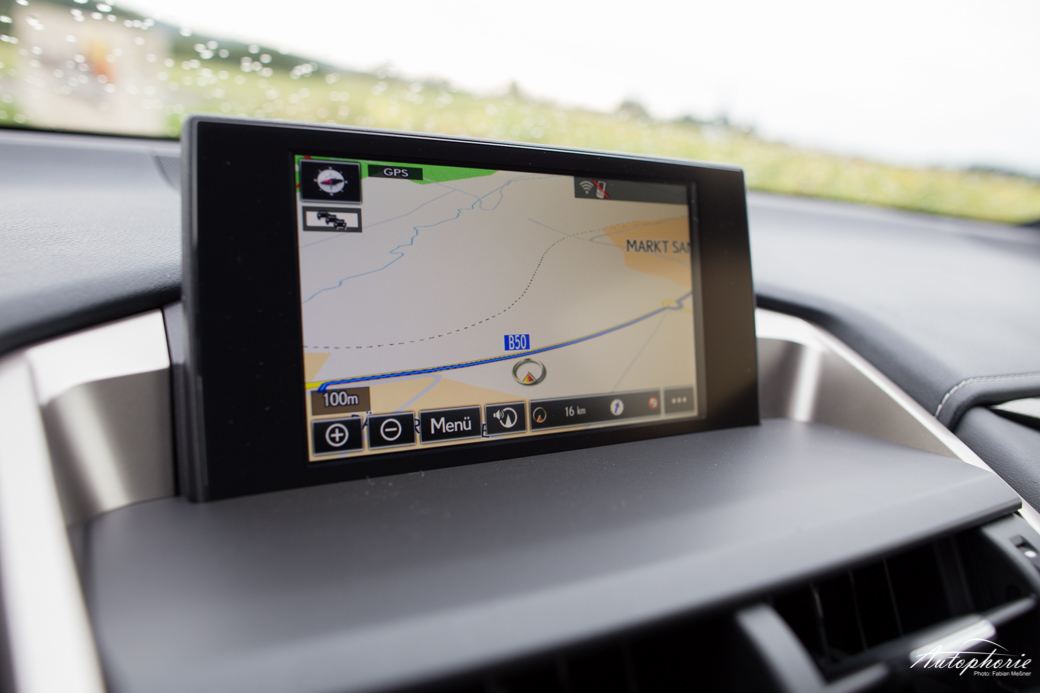 Der Lexus NX als solches lebt im Innenraum einem Mix aus aktuellem Zeitgedanke und den 80er Jahren. Da wären Holz- oder Titan-Applikationen, die gut aussehen, aber sich eben nicht gut anfühlen, da es leider nur (gut verarbeitetes) Plastik ist. Rein optisch machen die Streben in Tür und Armaturenbrett schon etwas her, aber eben nur bis man sie einmal anfasst. Die Mittelkonsole hat ein neues, deutlich bessere reagierendes sowie zu bedienendes Touchfeld spendiert bekommen, muss sich aber dem 80er Jahre-Charme von Gangwahlhebel und Knöpfen unterordnen. Der Screen steht zu zwei Drittel frei und lehnt sich nur unterhalb etwas an, wirkt aufgewertet, leider machen die überholten Grafiken den guten Eindruck wieder zu Nichte. Aber so eine Software lässt sich ja schneller überarbeiten, als eine Bedieneinheit. Vielleicht wird in diesem Feld noch nachgebessert.