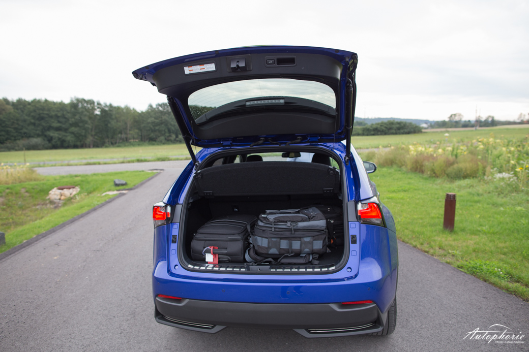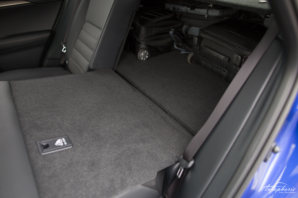 Womit der NX dagegen im Innenraum punkten kann ist Platz und Raumgefühl, sowie netten Gimmicks wie etwa die auf Berührung reagierenden Deckenleuchten. Auf den Fondsitzen ist (hinter mir) noch gut und gerne ausreichend Luft für unseren zwei Meter Mann Daniel. Auch bei einer längeren Fahrt sollten sich seine Knie nicht beklagen können. Auch die ansonsten eher unschöne Lüftung/Kühlung der Hybrid-Batterie ist nicht mehr in der Sitzlehne der Fondsitze, sondern unterhalb der Sitzbank angeordnet und verschwindet dadurch komplett aus dem Sichtfeld. Eine bei umgeklappter Rückbank plane Ladefläche erhöht den Multifunktionscharakter des NX. 1600 Liter sind dann zum Verladen frei, bei aufgestellter Rückbank sind es noch immer akzeptable 555 Liter.