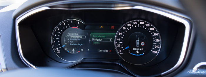 Absolute Neuerungen gibt es nicht, einzig Klassen-Standards sind auf der Optionsliste, darunter auch Rückfahrkamera, Toter-Winkel-Assistent oder eine adaptive Geschwindigkeitsregelung. Letztere funktioniert in meinen Augen sehr zuverlässig, bremst sanft auf langsamere vorrausfahrende Fahrzeuge ab und beschleunigt nach dem Ausscheren wieder. Das Fahrgefühl als solches ist ein durchweg gutes, kein Sportwagen aber auch kein absoluter Langweiler, eben irgendwo dazwischen, genau, wie man es von einem Mondeo erwarten würde. Die Settings für das Fahrwerk mit der elektronischen Dämpferregelung sind leider tief in den Einstellungsmöglichkeiten des Touchscreen versteckt und nicht über einen zusätzlichen haptischen Knopf zu erreichen. Daher kann ich mir hier nur auf die angebliche „Sport“-Stellung beziehen.