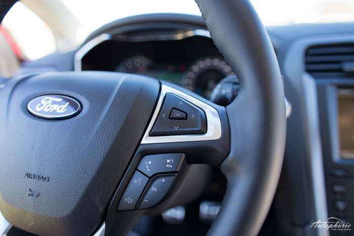 Das Tastenwirrwarr in der Mittelkonsole hat mit Sync 2 bzw. dem 20,3 cm (diagonal) großen Touchscreen endlich ein Ende. An sich sehr übersichtlich lassen sich immer die vier Hauptpunkte über die vier Ecken anwählen. Das sind dann im Einzelnen die Audiowiedergabe, die Navigation, die Telefonfunktion und die exakte Klimasteuerung. Diese lässt sich im groben auch über die Tasten unter dem Bildschirm einstellen. Der Zoom der Navigation lässt sich leider nur in drei Stufen verstellen: 200 m, 10 km und 20 km. In verwinkelten Gassen muss man dann schon ganz genau hinhören, was die Dame sagen will, denn auch in der Tachoeinheit wird es dann kompliziert. Diese ist neuerdings auch mit vielen Informationen belangt. Über das linke Steuerkreuz am Lenkrad lassen sich Infos aus dem Bordcomputer abrufen oder Anzeigen verstellen (Darstellung innerhalb des Drehzahlmessers). Mittig sind Informationen über Musikwiedergabe, Navigation oder Telefon dargestellt – diese lassen sich über das rechte Steuerkreuz auswählen. Im eigentlichen Tacho wird dann die aktuell erlaubte Geschwindigkeit eingeblendet (Verkehrszeichenerkennung per Kamera).