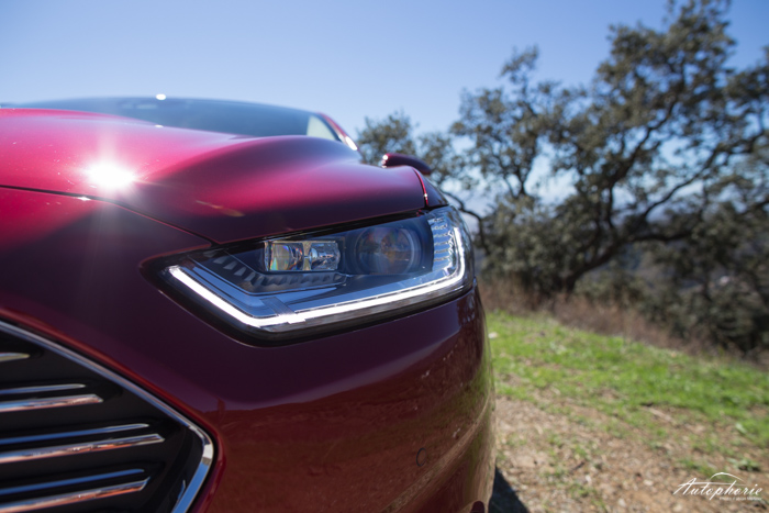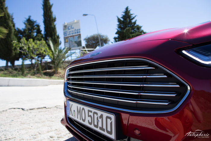 Der neue Ford Mondeo ist vor allem im äußeren Erscheinungsbild ein echter Hingucker. Sehr scharf gezeichnete LED-Scheinwerfer (1.250 Euro), die ihm eine sportliche Front samt dem großen Chrom-Grill verschaffen (eher amerikanische Optik). Eine tiefe Linie, die sich über die angedeuteten Power-Dome in der Motorhaube nach oben zieht und schlussendlich am Maserati-Heck wieder sauber abfällt. Innen sind die Materialen weich, komfortabel geschnitten und es stellt sich ein gutes (großes) Raumgefühl ein. Das Winterkorn-Prädikat „da klappert nichts“ hat er sich ebenso verdient. Es sind mitunter nur Kleinigkeiten, die von außen mehr versprechen als er innen halten kann. Vielleicht nicht „Top in class“, dazu fehlen aktuelle technische Spielereien gerade in der Mittelkonsole. Das kann der in den kleinen Werbefilmen auf’s Korn genommene Passat dann leider doch deutlich besser – der kostet dann natürlich auch etwas mehr.