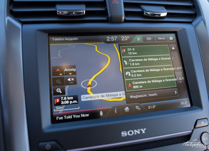 Das Tastenwirrwarr in der Mittelkonsole hat mit Sync 2 bzw. dem 20,3 cm (diagonal) großen Touchscreen endlich ein Ende. An sich sehr übersichtlich lassen sich immer die vier Hauptpunkte über die vier Ecken anwählen. Das sind dann im Einzelnen die Audiowiedergabe, die Navigation, die Telefonfunktion und die exakte Klimasteuerung. Diese lässt sich im groben auch über die Tasten unter dem Bildschirm einstellen. Der Zoom der Navigation lässt sich leider nur in drei Stufen verstellen: 200 m, 10 km und 20 km. In verwinkelten Gassen muss man dann schon ganz genau hinhören, was die Dame sagen will, denn auch in der Tachoeinheit wird es dann kompliziert. Diese ist neuerdings auch mit vielen Informationen belangt. Über das linke Steuerkreuz am Lenkrad lassen sich Infos aus dem Bordcomputer abrufen oder Anzeigen verstellen (Darstellung innerhalb des Drehzahlmessers). Mittig sind Informationen über Musikwiedergabe, Navigation oder Telefon dargestellt – diese lassen sich über das rechte Steuerkreuz auswählen. Im eigentlichen Tacho wird dann die aktuell erlaubte Geschwindigkeit eingeblendet (Verkehrszeichenerkennung per Kamera).
