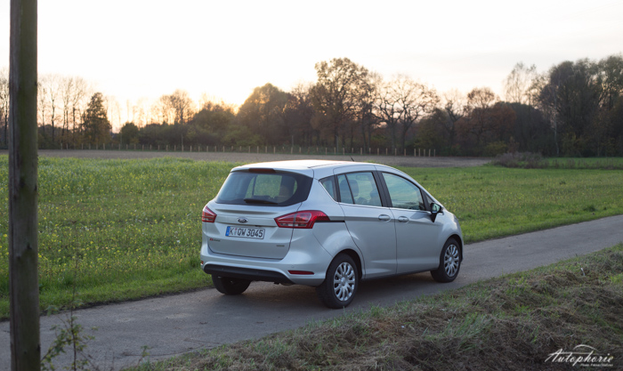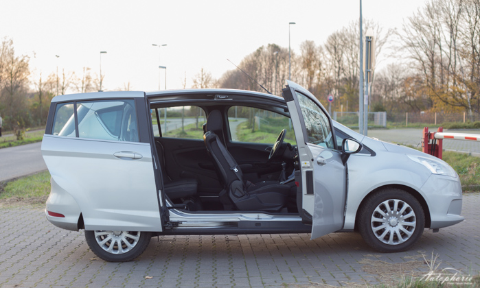 Klar besonders in silber-metallic ist der Ford B-Max nicht der typische Wagen zum Frauen aufreißen, seine Qualitäten liegen in anderen Belangen. Ein tiefes blau würde dem Wagen deutlich besser zu Gesicht stehen. Alleine die Schiebetüren und die Konstruktion um die B-Säule verleihen ihm einen einzigartigen Charme. Der Kraftaufwand, der aufgebracht werden muss, ist deutlich höher als bei vergleichbaren Türen (die an einer B-Säule schließen). Auch die Fahrer und Beifahrertür sind gefühlt etwas schwerer. Der praktische Vorteil überwiegt dennoch. Selbst kaufen würde ich ihn in meiner Position nicht, junge Eltern die einen SUV vorziehen kann ich allerdings nicht verstehen. Da fehlt es wohl an fehlendem Durchblick für das Große Ganze.